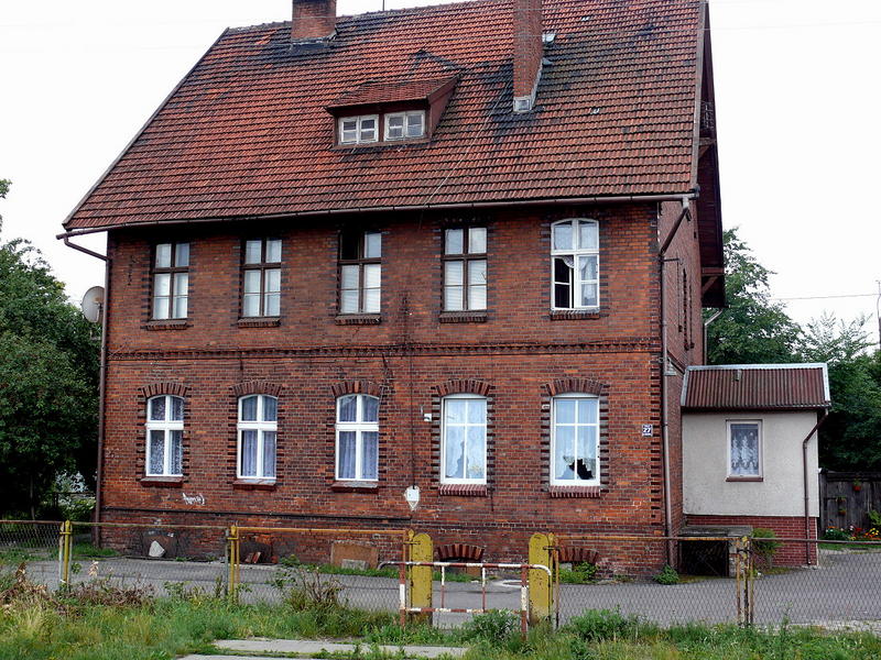 Dawny budynek administracyjny stacji przy ul. Kaszubskiej 28. Obecnie znajdują się w nim mieszkania komunalne. Widok w kierunku zachodnim. Za plecami perony.