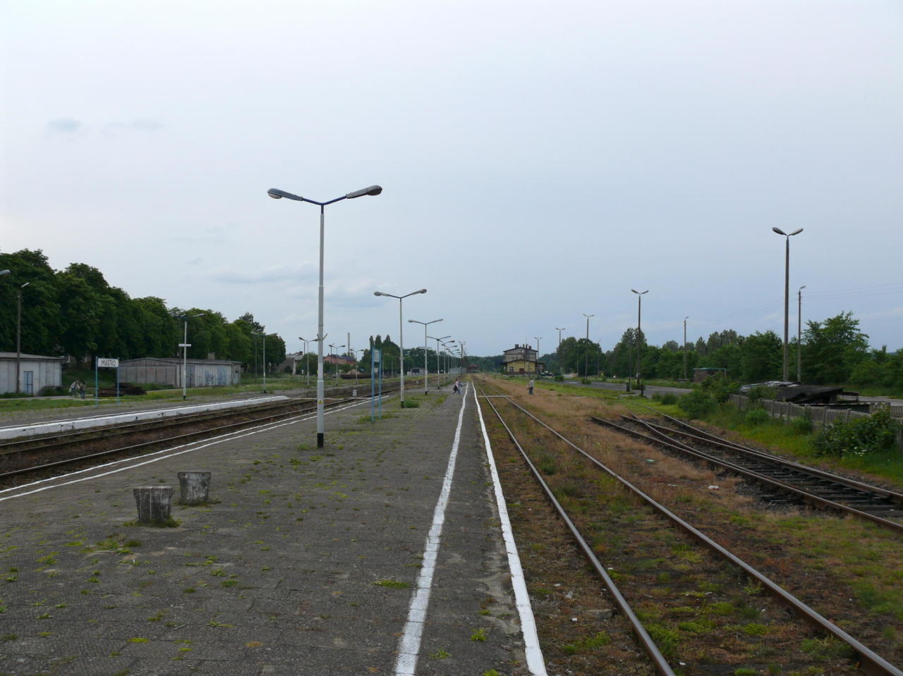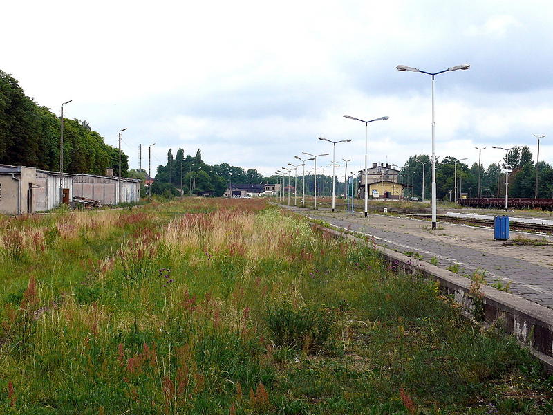 Peron 1, z którego odjeżdżają pociągi do Słupska. W tle ekspedycja towarowa. Widok w kierunku północnym: Korzybie/Słupsk, dawniej także Bytów.