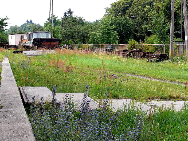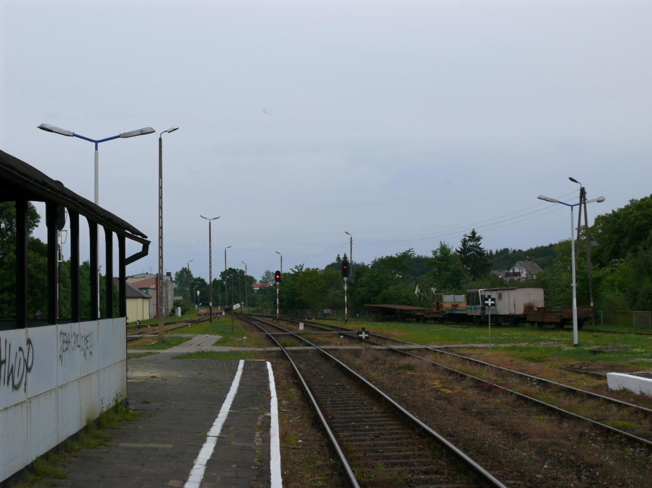 Fragment krawędzi peronu 2. Widoczne rozebrane dwa tory dawnej "Kolei Chojnickiej" Trzeci tor pozostał, ale jest niewykorzystywany. Widok w kierunku południowym: Szczecinek i (dawniej) Człuchów, przez Słosinko.