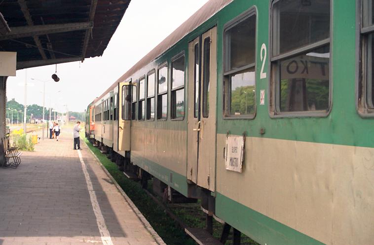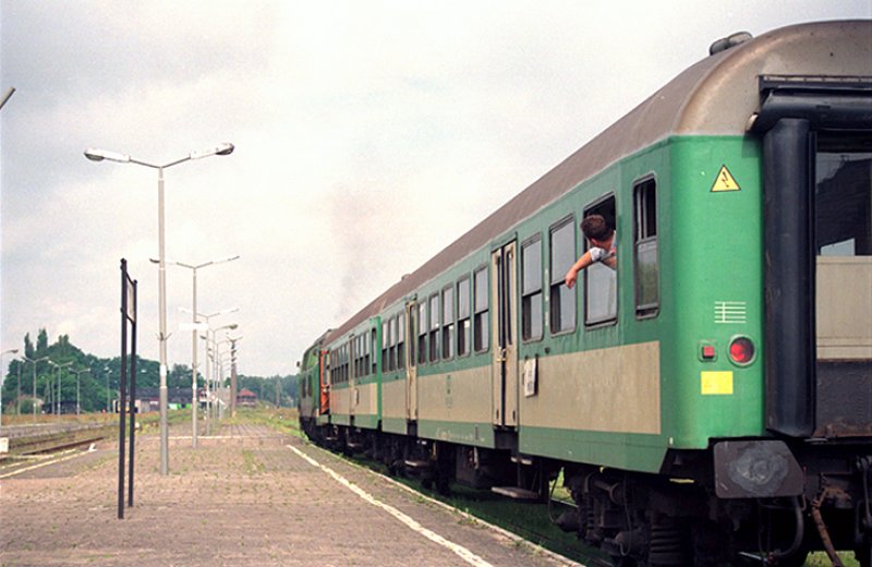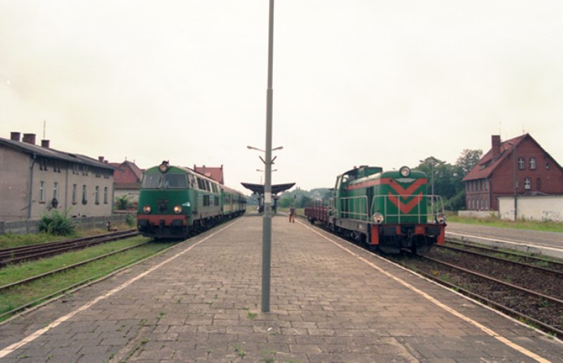 Skład pociągu osobowego, relacji Słupsk - Szczecinek. Wjeżdża na peron 2. Planowy odjazd godzina 9:59. Widok w kierunku północnym: Korzybie/Słupsk, dawniej także Bytów.