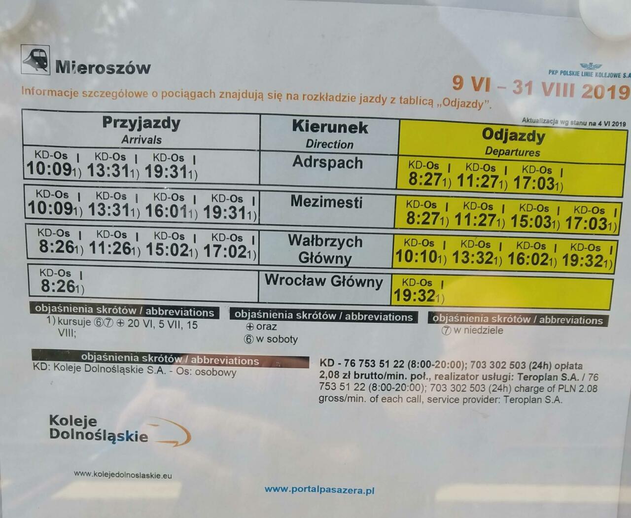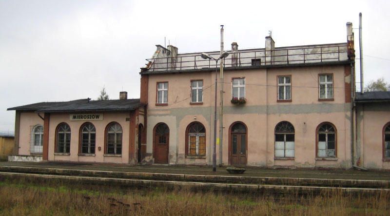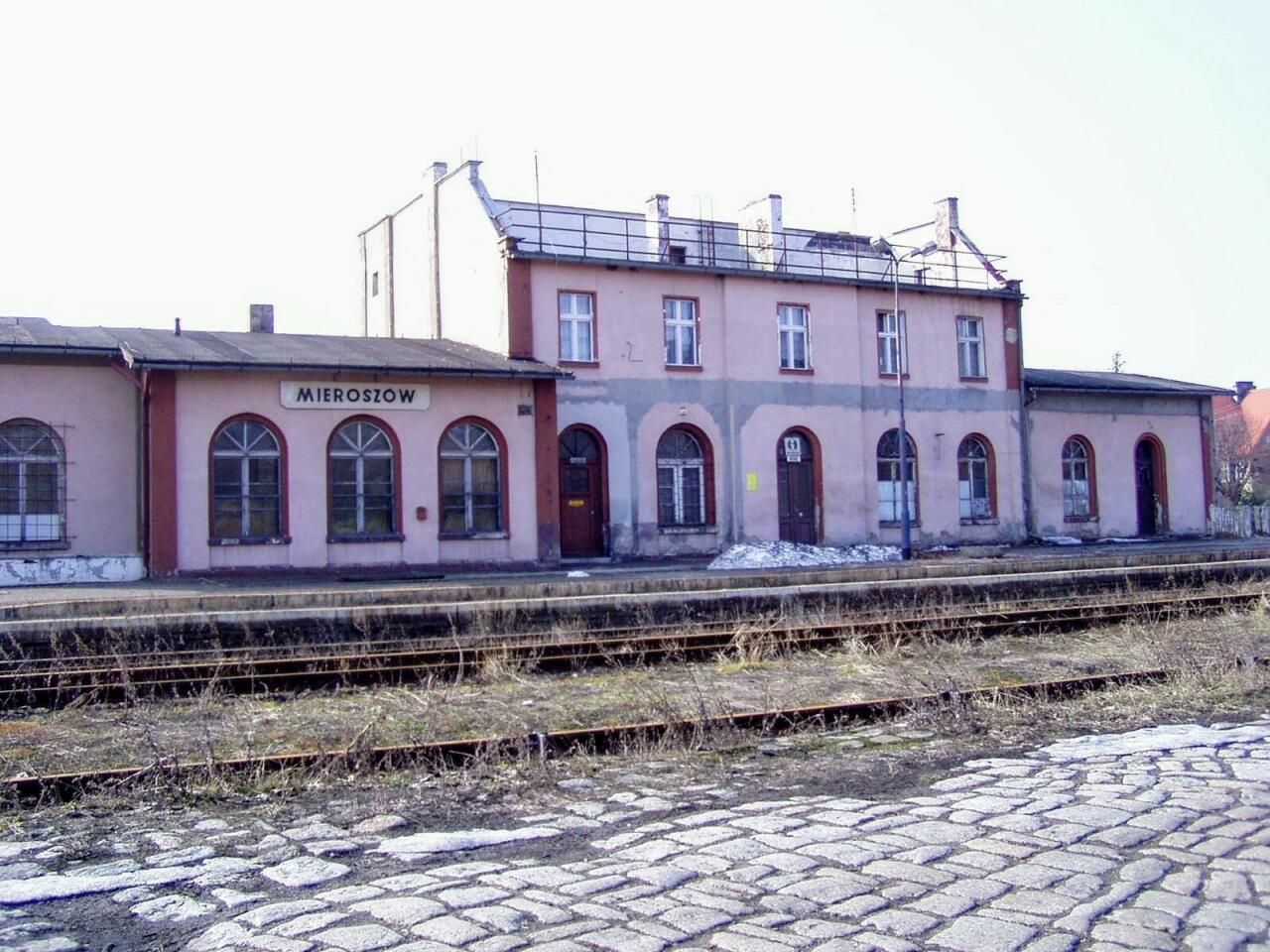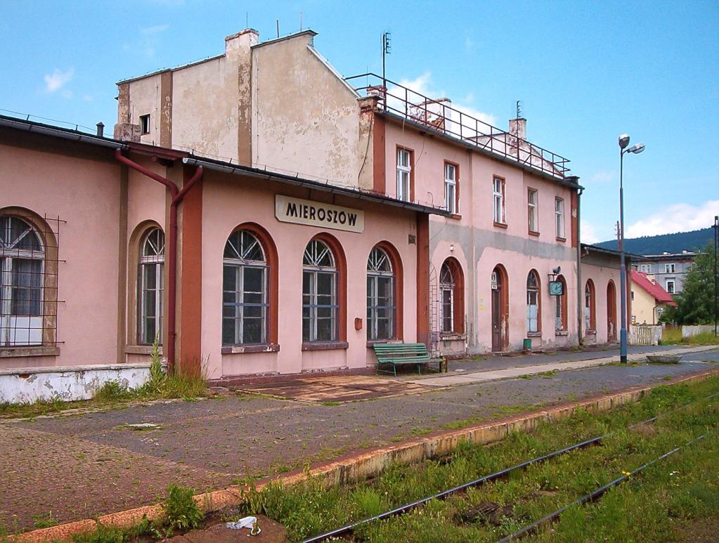 Stacja PKP Mieroszów. Budynek dworca z pomieszczeniem nastawni, w przybudówce na parterze. Widok od strony peronów w kierunku zachodnim; w prawo Boguszów-Gorce Wschód/Wałbrzych, w lewo Mezimesti.