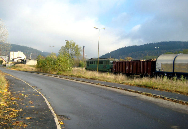 Stacja PKP Mieroszów. Na pierwszym planie ul. Dworcowa. Z prawej pociąg towarowy wjeżdża w jesiennej, górskiej aurze od strony Mezimesti. Widok w kierunku północnym; w tle dworzec.