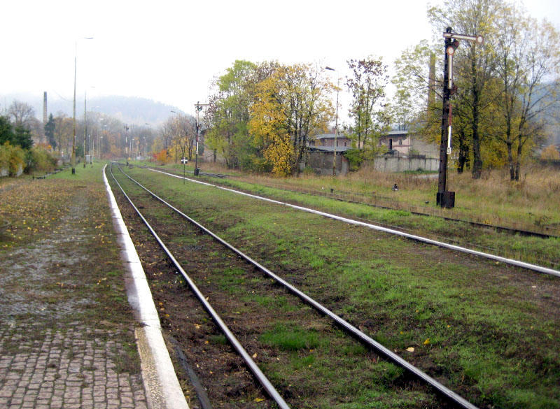 Perony i fragment budynku dworca. W tle przedwojenne słupy po trakcji elektrycznej. Widok w kierunku północnym (Boguszów-Gorce Wschód/Wałbrzych).