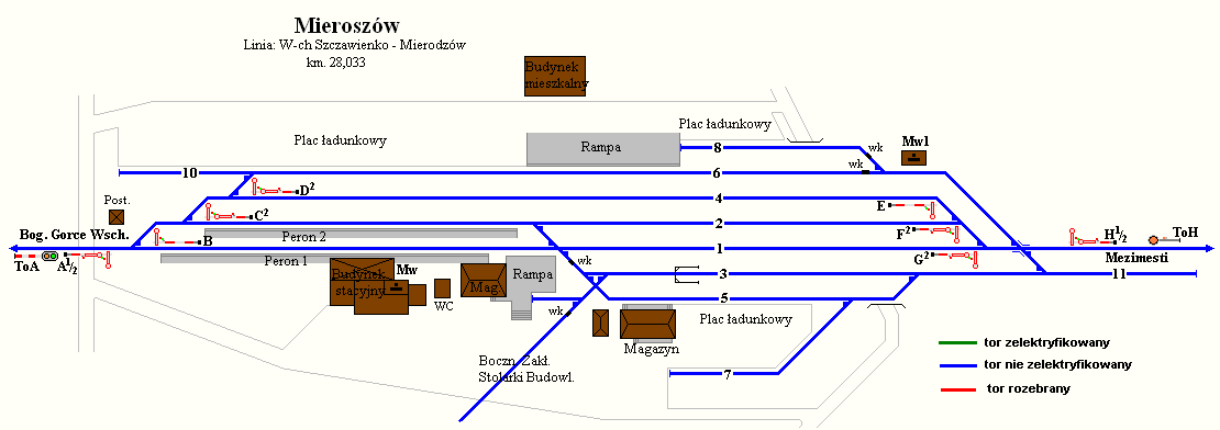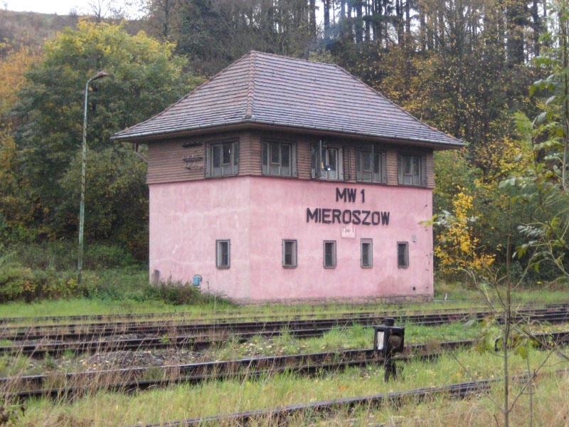 Stacja PKP Mieroszów. Budynek dworca z pomieszczeniem nastawni, w przybudówce na parterze. Widok od strony "zatorza" w kierunku południowo-zachodnim; w prawo Boguszów-Gorce Wschód/Wałbrzych, w lewo Mezimesti.