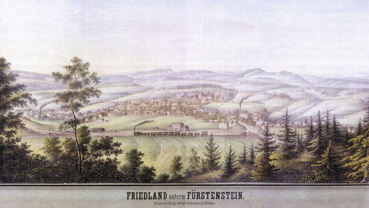 Widok na Mieroszów, naturalnie ze stacją kolejową w punkcie centralnym ;-) Najprawdopodobniej jest to obraz namalowany pomiędzy 1887 a 1914 rokiem. Kierunek zachodni; w lewo Mezimesti, w prawo Boguszów-Gorce Wschód/Wałbrzych.