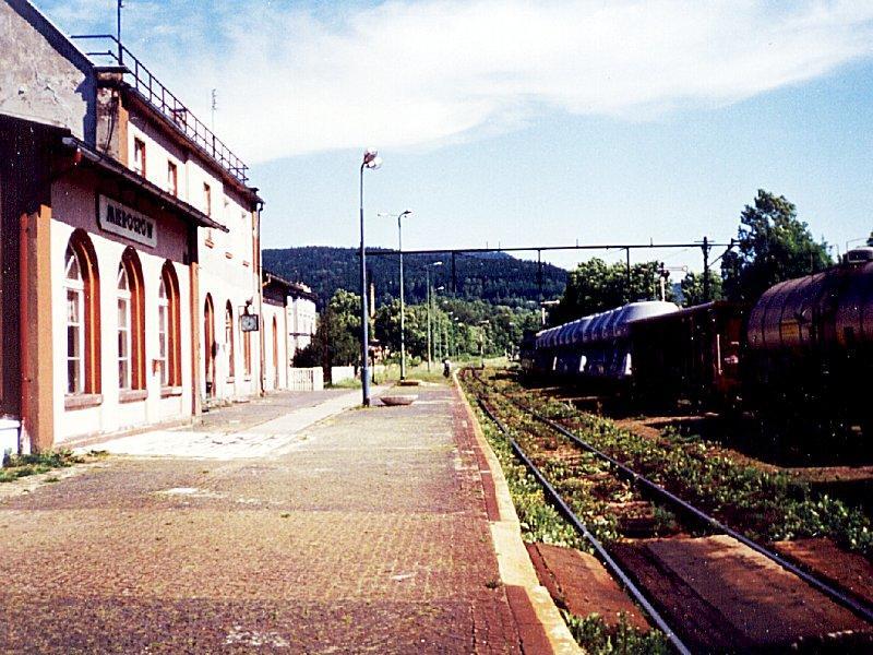 Widok na perony i budynek dworca z pomieszczeniem nastawni, od strony wjazdu z Mezimesti. Kierunek północny. Ze stacji zostały już wycięte przedwojenne bramki trakcyjne.