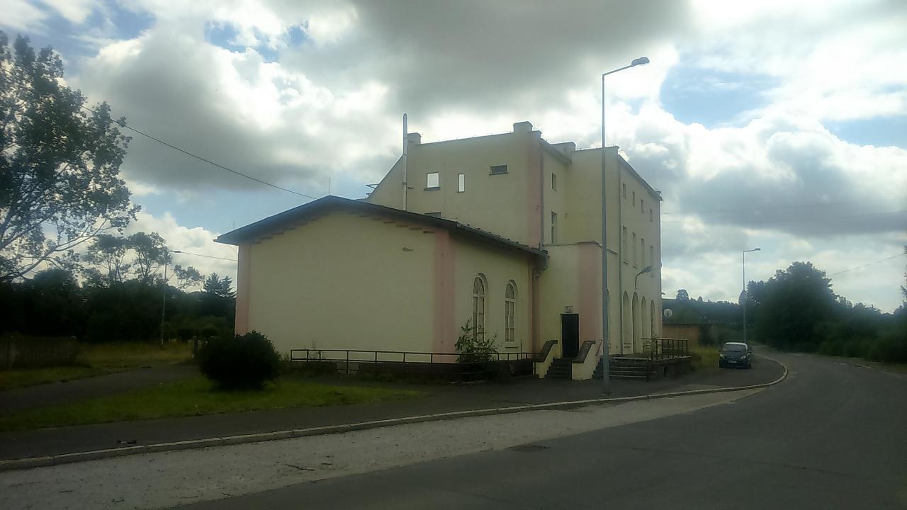 Budynek dworca z pomieszczeniem nastawni. Widok od strony peronów i wjazdu z Mezimesti. Kierunek północno-zachodni.