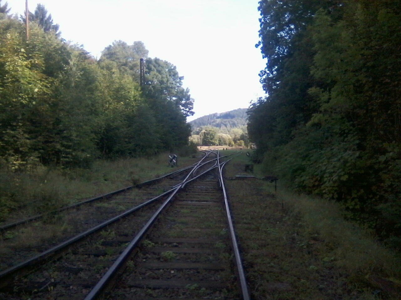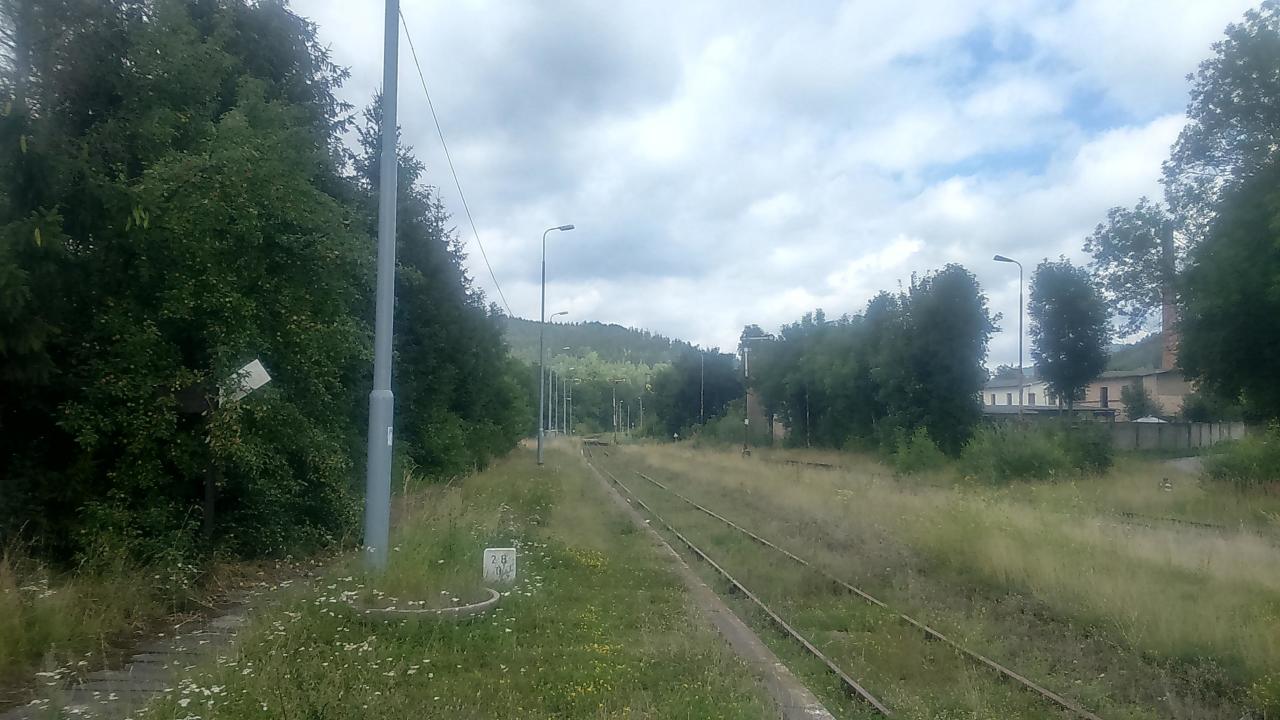 Wjazd na stację Mieroszów od strony granicy Mezimesti. Kierunek północny. W środku kadru tor główny, zasadniczy. Z lewej dochodzi tor wyciągowy.