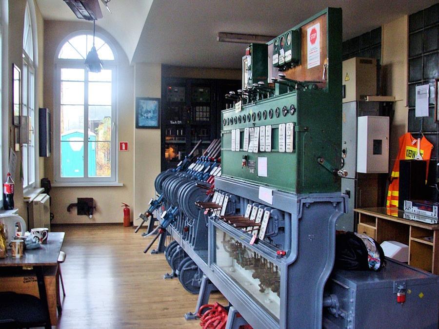 Na fotografii widoczne są dźwignie pędni semaforów kształtowych, a także aparat blokowy. Ogółem - nic specjalnego, wciąż tak wygląda zdecydowana większość urządzeń nastawczych na terenie Polski.
