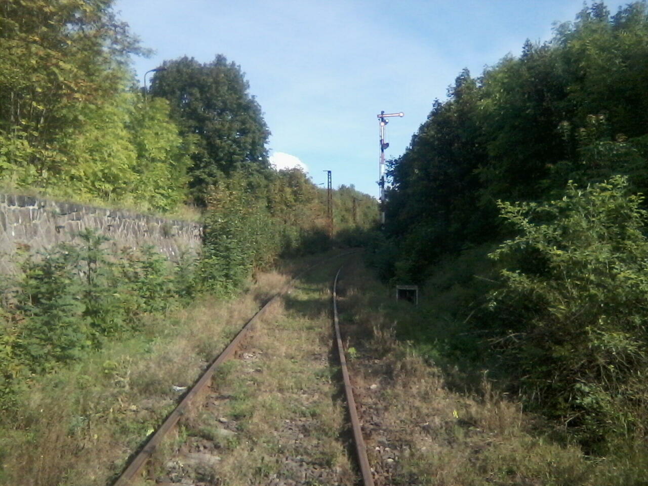 Semafor wjazdowy na stację Mieroszów od strony Mezimesti. Z lewej, na nasypie wzmocnionym murem oporowym, znajduje się tor wyciągowy. Kierunek północny.