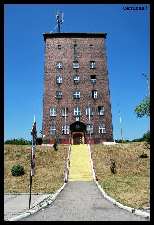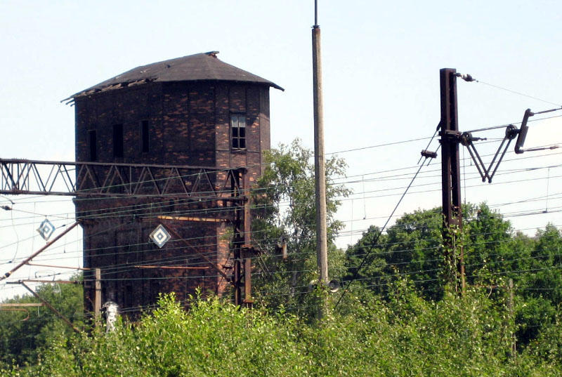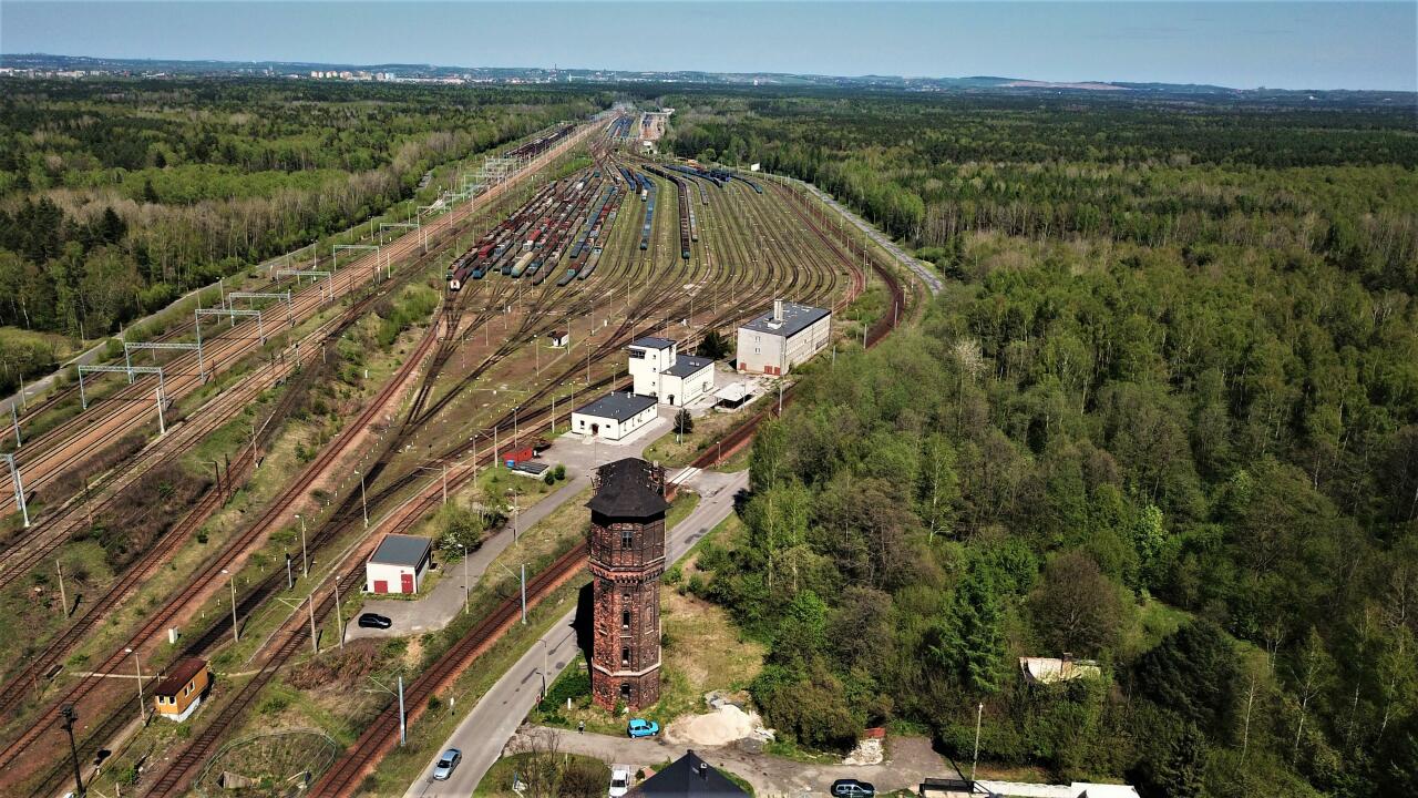 Widok na wieżę ciśnień znajdującą się obok górki rozrządowej.