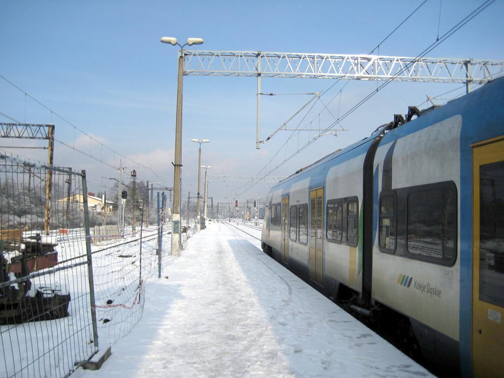 Peron 2. Widok w kierunku Zawiercia. na peronie pociąg Kolei Śląskich relacji Częstochowa Osobowa - Gliwice.