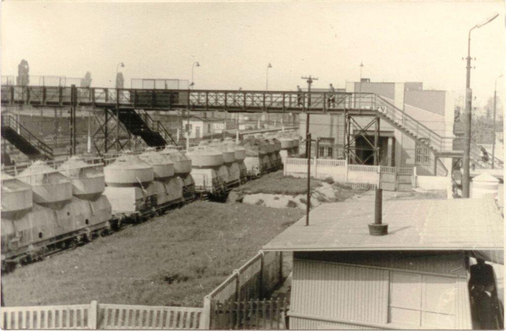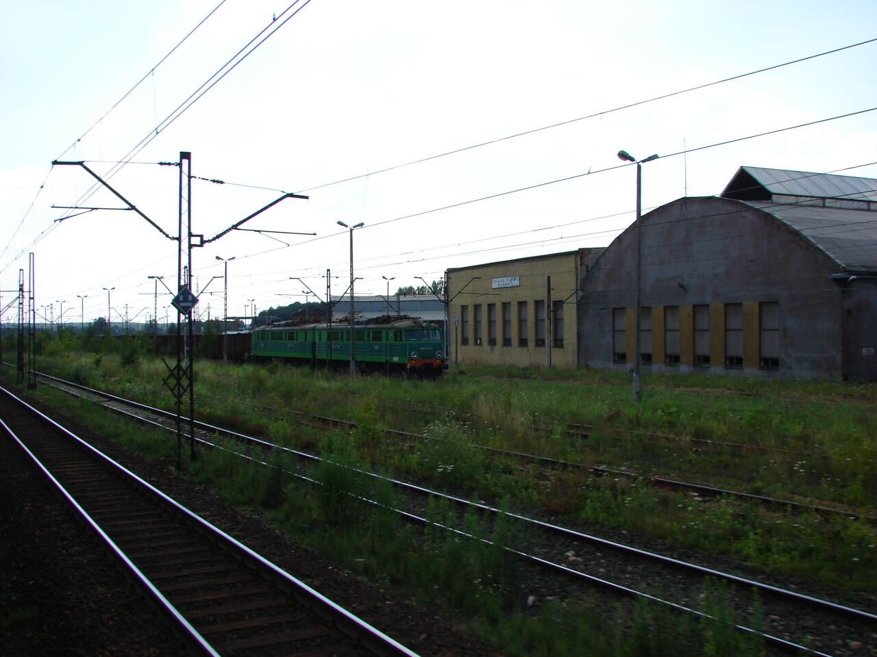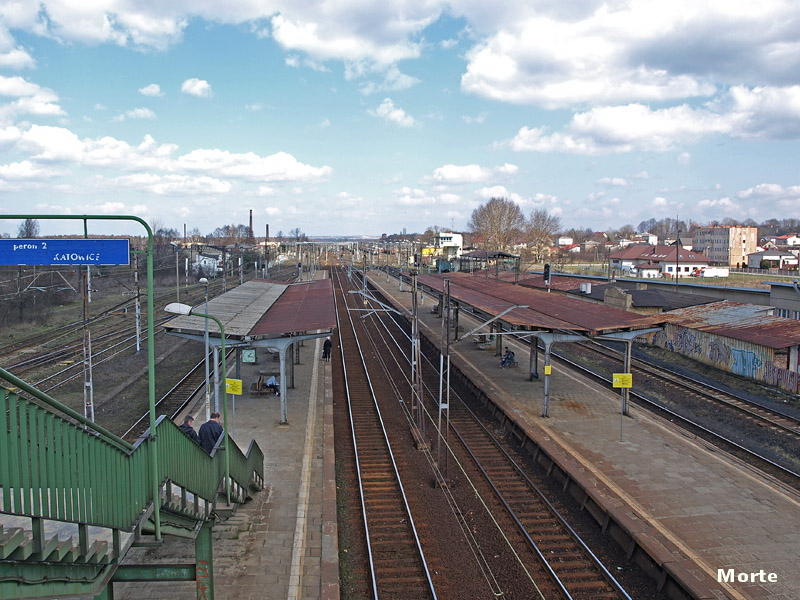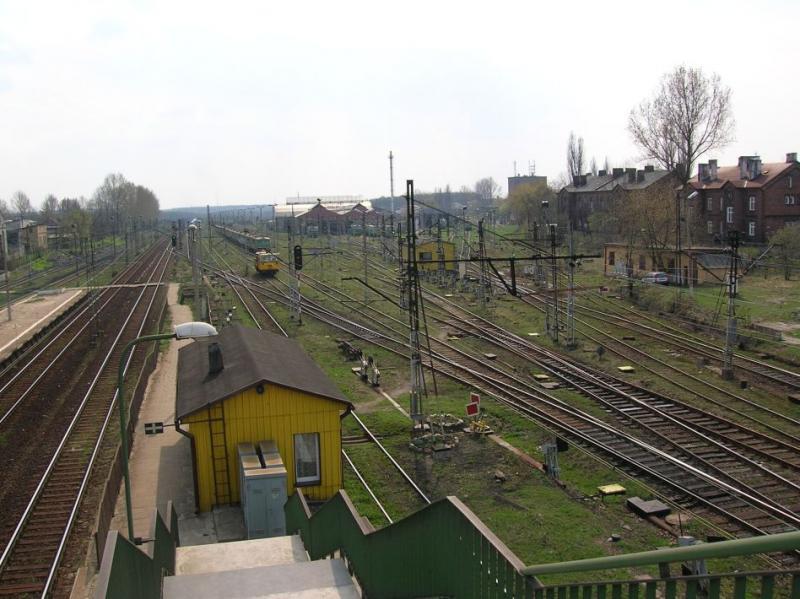 Widok z kładki nad peronami w kierunku czynnego jeszcze ZT Łazy. Pośrodku żółty budynek punktu kontrolnego, a po lewej ledwo widoczny komin koksowni Przyjaźń.