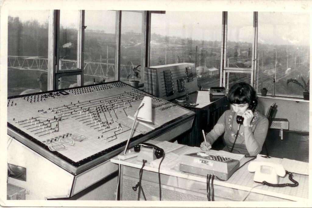 Dyżurna ruchu p. Barbara Upława na stanowisku pracy w nastawni ŁB w Łazach w latach 70-tycy. Zdjęcie udostępniła p. Upława, udostępniane poprzez Bibliotekę Publiczną Miasta i Gminy w Łazach.