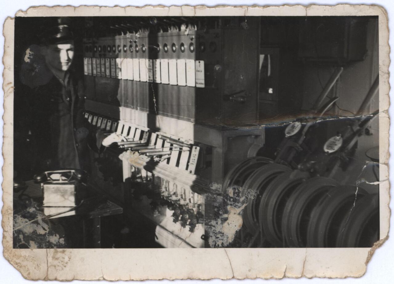 Dyżurny ruchu - p. Leopold Pawlik - w nastawni Łb13 w Łazach w latach 50-tych. Zdjęcie udostępnione poprzez Bibliotekę Publiczną Miasta i Gminy w Łazach.