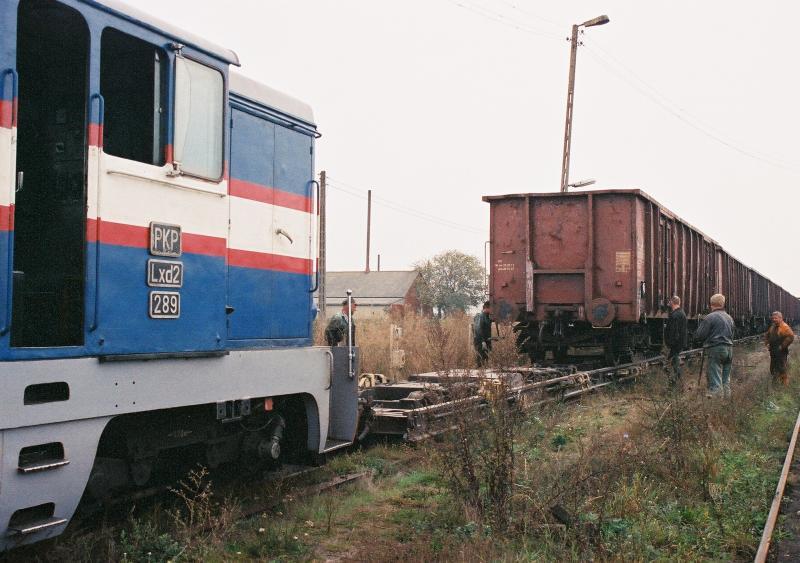 Wlasnie pierwszy wagon normalnotorowy zbliza sie do czola skladu.Lxd2-289 w nowym malowaniu.