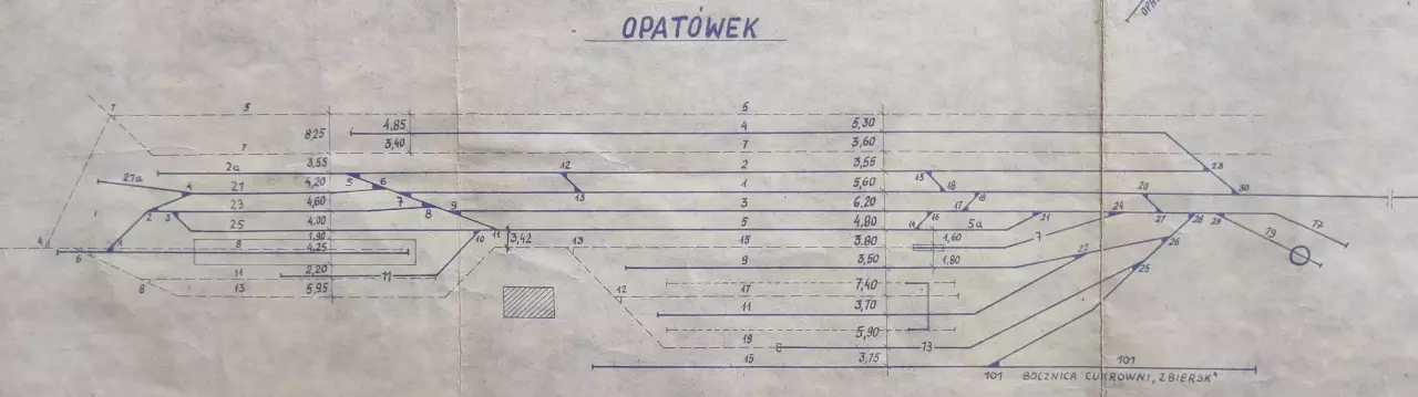 Schemat uproszczony stacji Opatówek Wąskotorowy. Skan fragmentu planu schematycznego Kaliskiej Kolei Dojazdowej, wykreślony przez pracowników Zarządu Kolei Dojazdowych w Poznaniu. Stan - luty 1974 rok.