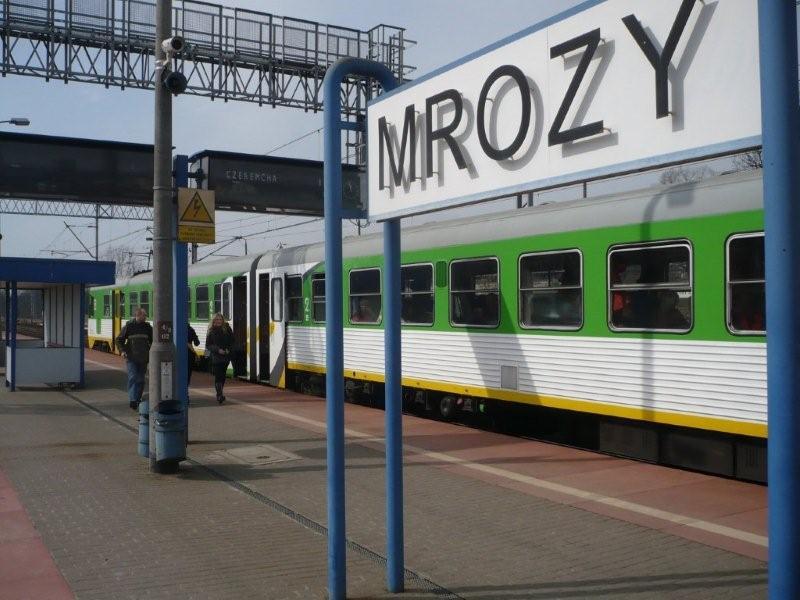 Mrozy. Pociąg osobowy KM z Siedlec do Warszawy zatrzymał się na stacji. Nad peronem widoczna tablica informacyjna firmy "Pragotron".