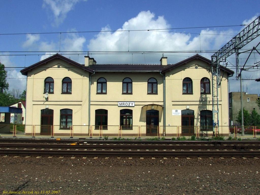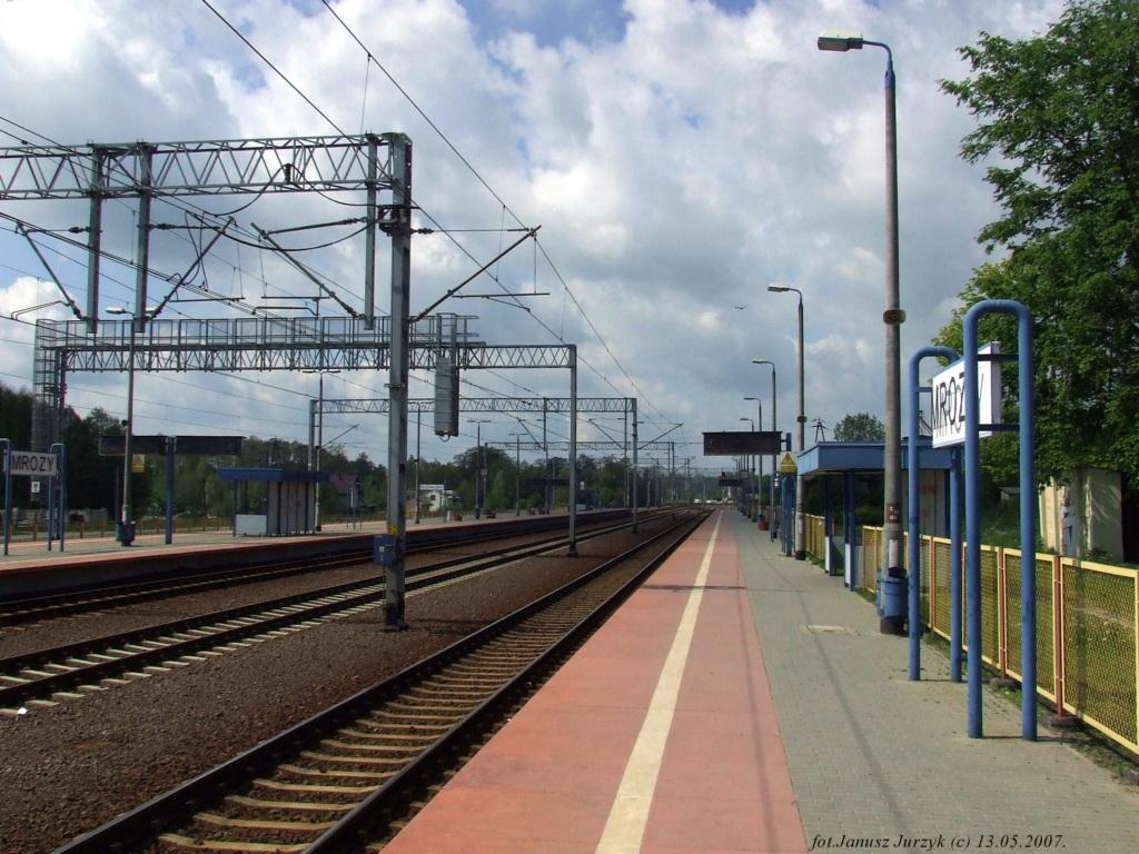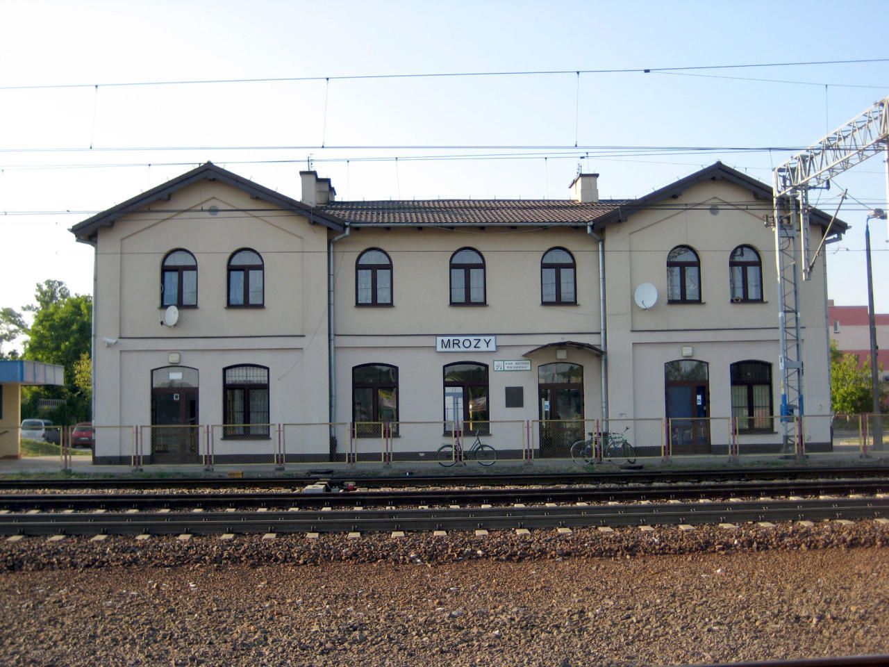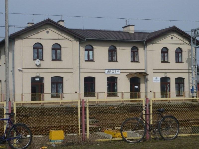 Widok na stację kolejową w Mrozach, w kierunku zachodnim.