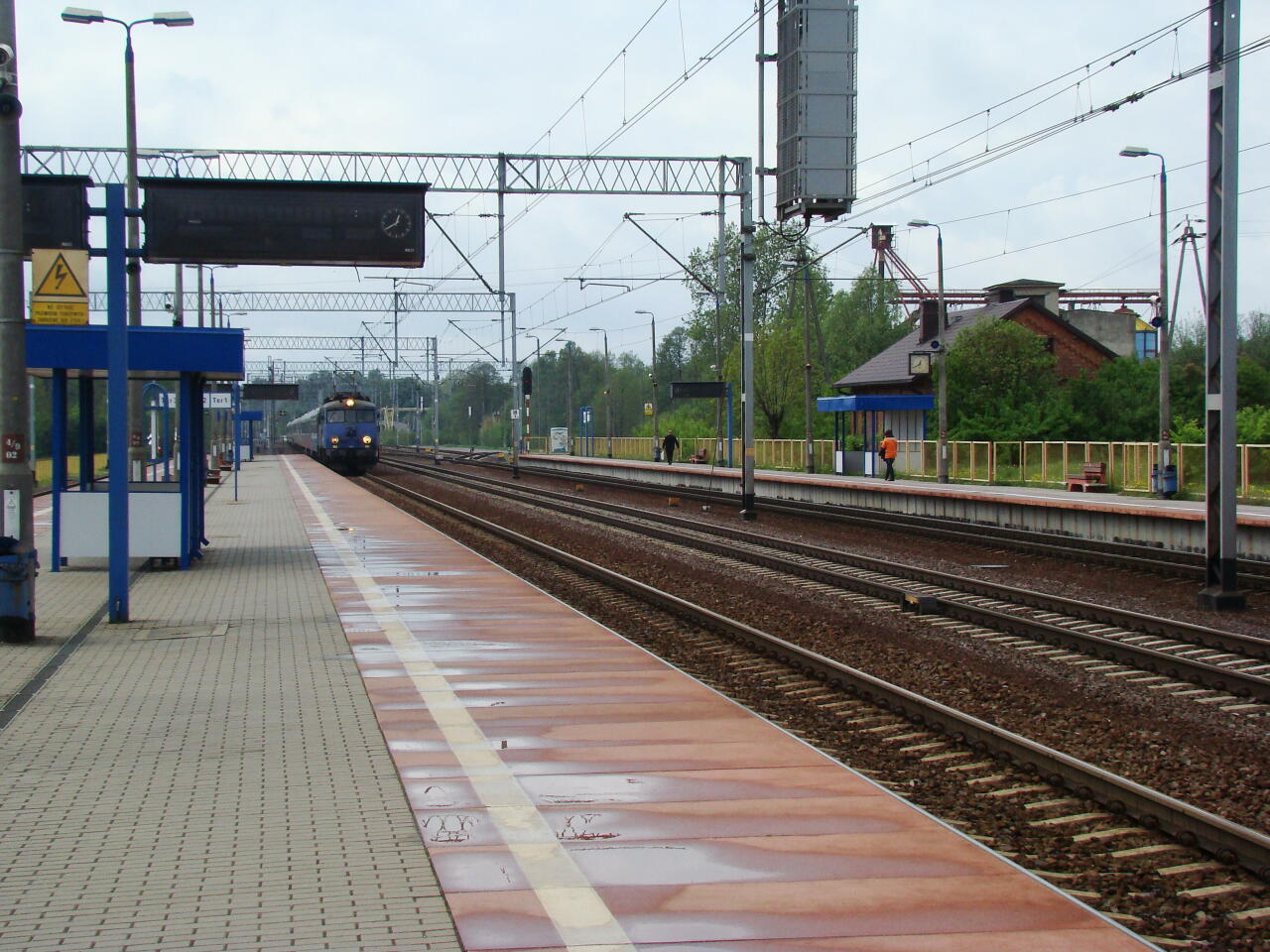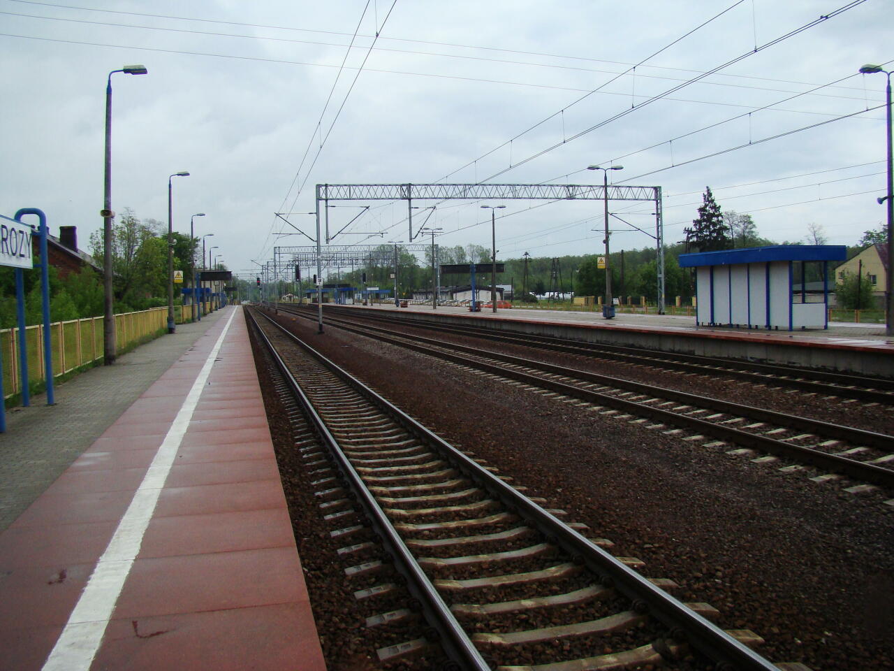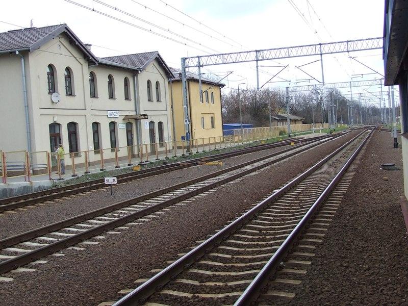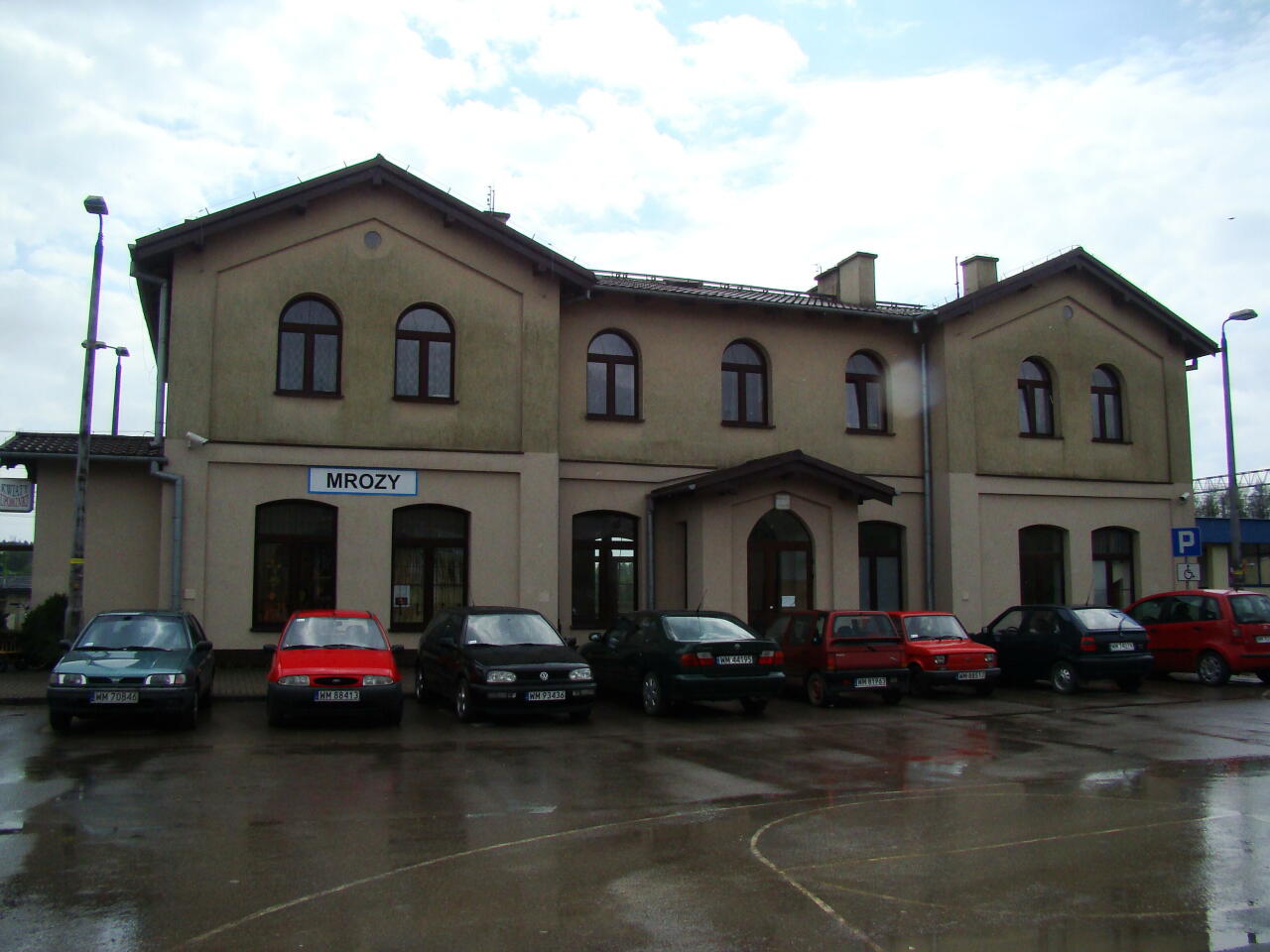 Widok na stację kolejową w Mrozach, w kierunku zachodnim.