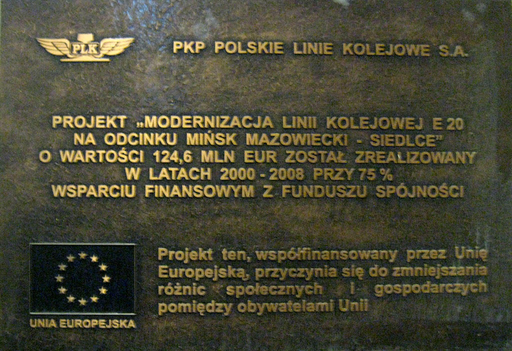 Stacja PKP Mrozy. Tablica w przejściu podziemnym mówiąca o modernizacji stacji.