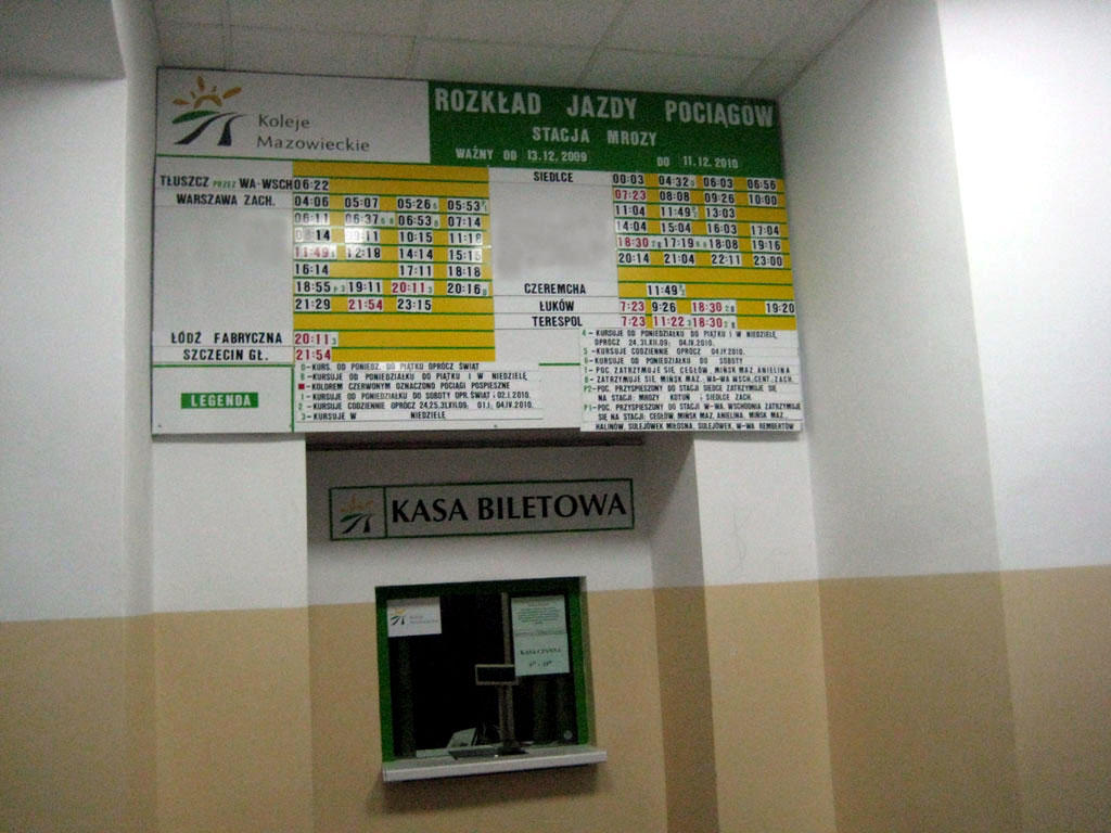 Stacja PKP Mrozy. Kasa biletowa Kolei Mazowieckich i rozkład jazdy w budynku dworcowym.