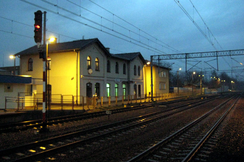 Stacja PKP Mrozy. Widok na budynek dworcowy o zmierzchu z peronu 2.