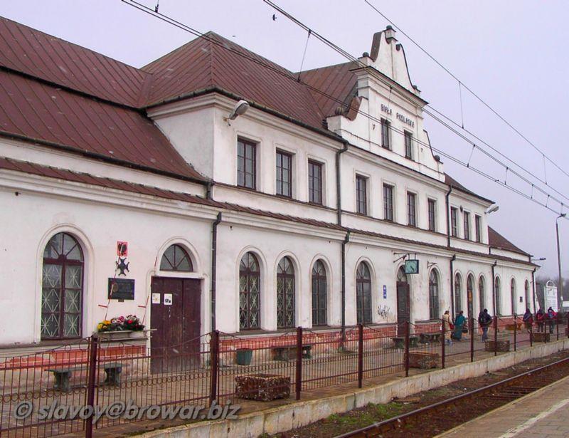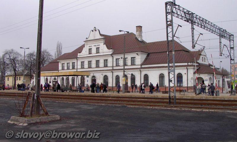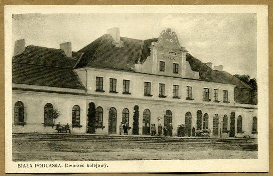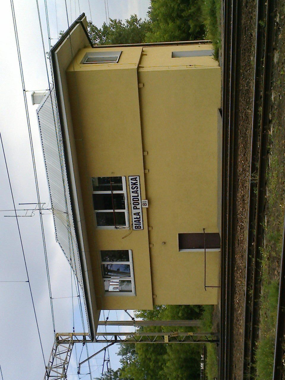 Budynek dworca PKP Biała Podlaska od strony południowo – zachodniej. Widok w kierunku Białej Podlaskiej Rozrządowej, Małaszewicz i Terespola. Dworzec ten z tej perspektywy można obejrzeć na YouTube na jednominutowym filniku "Gomulka Returns Triumphant 1956", https://www.youtube.com/watch?v=P3bjaJ6vy4U. Filmik przedstawia przejazd Władysława Gomułki pociągiem przez stację Biała Podlaska w 1956 roku.