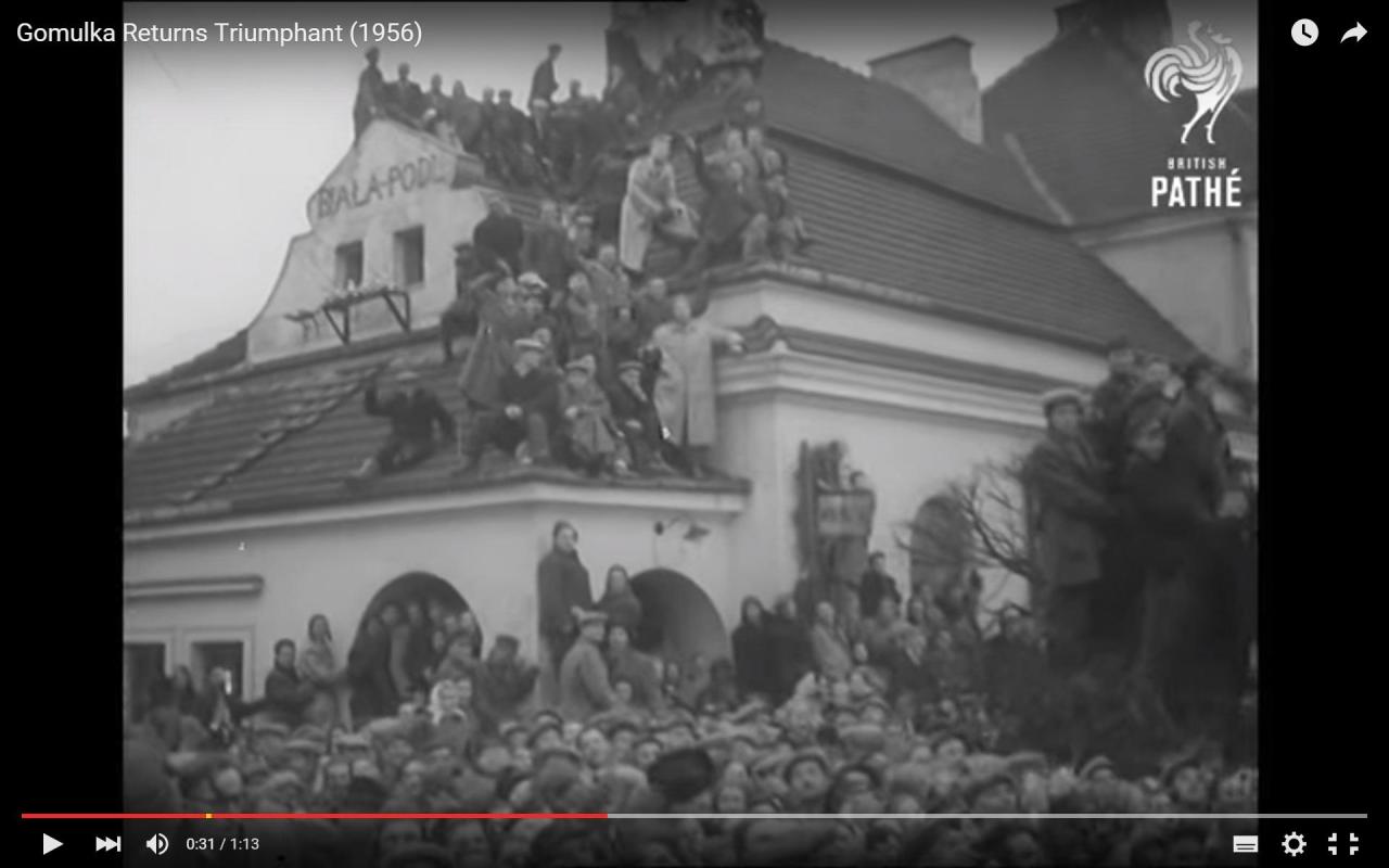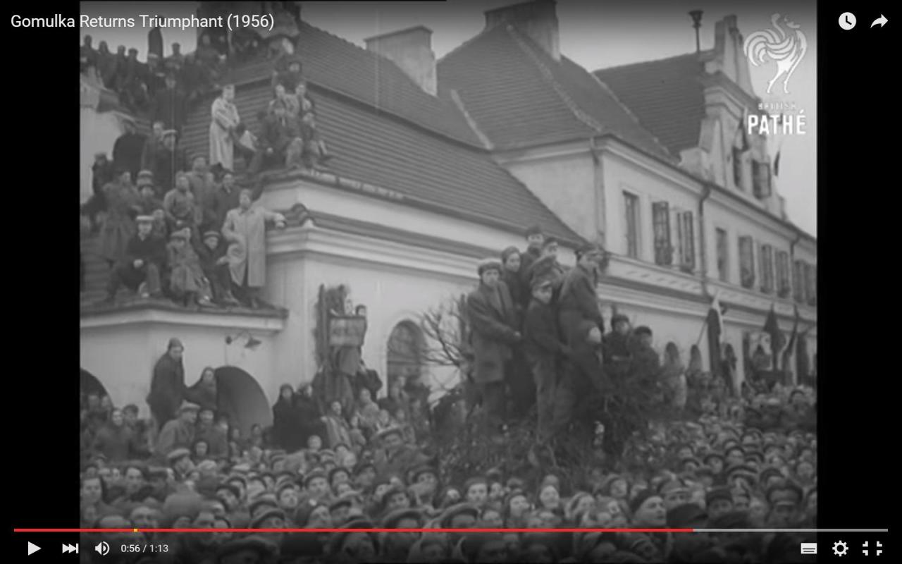 Kadr z krótkiego filmiku na TouTube "Gomulka Returns Triumphant 1956" o przyjeździe specjalnego pociągu z I sekretarzem KC PZPR Władysławem Gomułką do Białej Podlaskiej. Na kadrze dworzec PKP od strony torów/południowo - zachodniej. Widok w kierunku Chotyłowa i Terespola.
