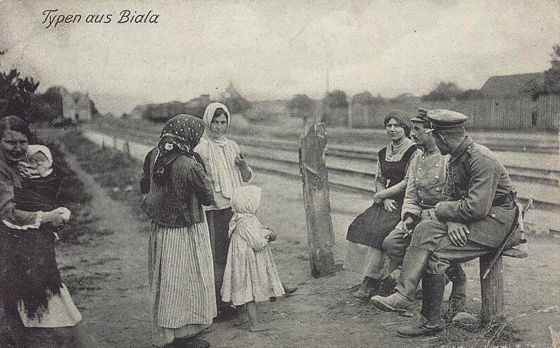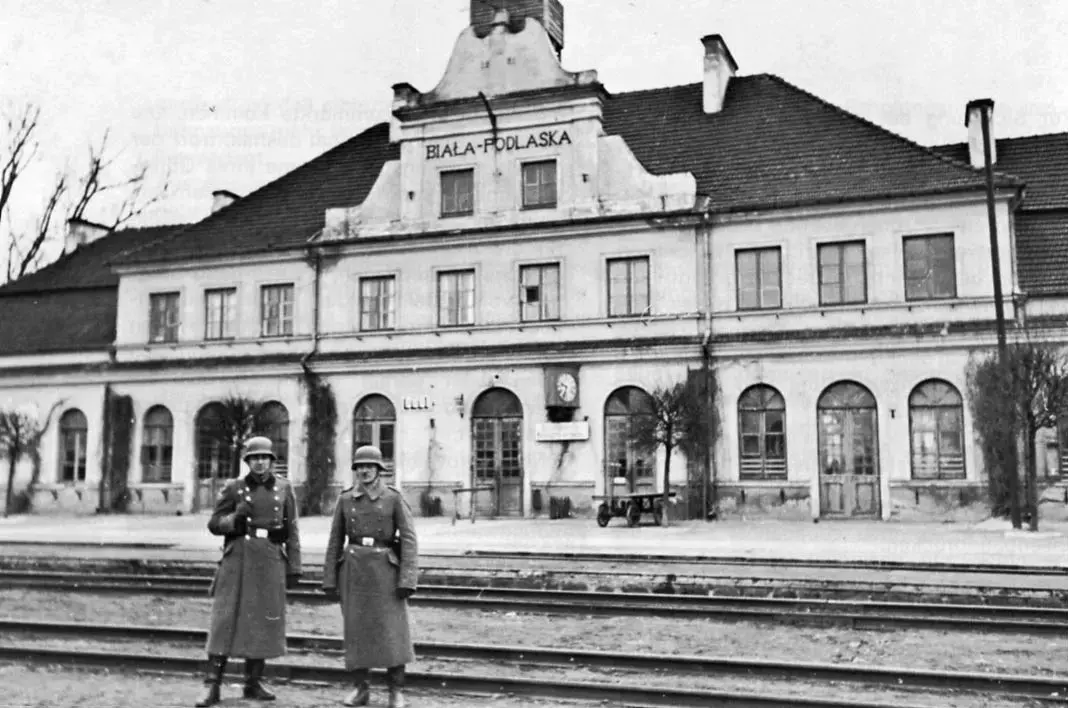 Dworzec stacji Biała-Podlaska (z myślnikiem, jak na fotografii) od strony torów, w czasie okupacji niemieckiej. Zima z 1940 na 1941. Zdjęcie datowane na marzec 1941 wg źródła niemieckiego. Jeden ze stojących żołnierzy (po lewej na fotografii) prawdopodobnie należy do formacji policyjnej (oceniając m.in. po barwie wyłogów kołnierza płaszcza zimowego).