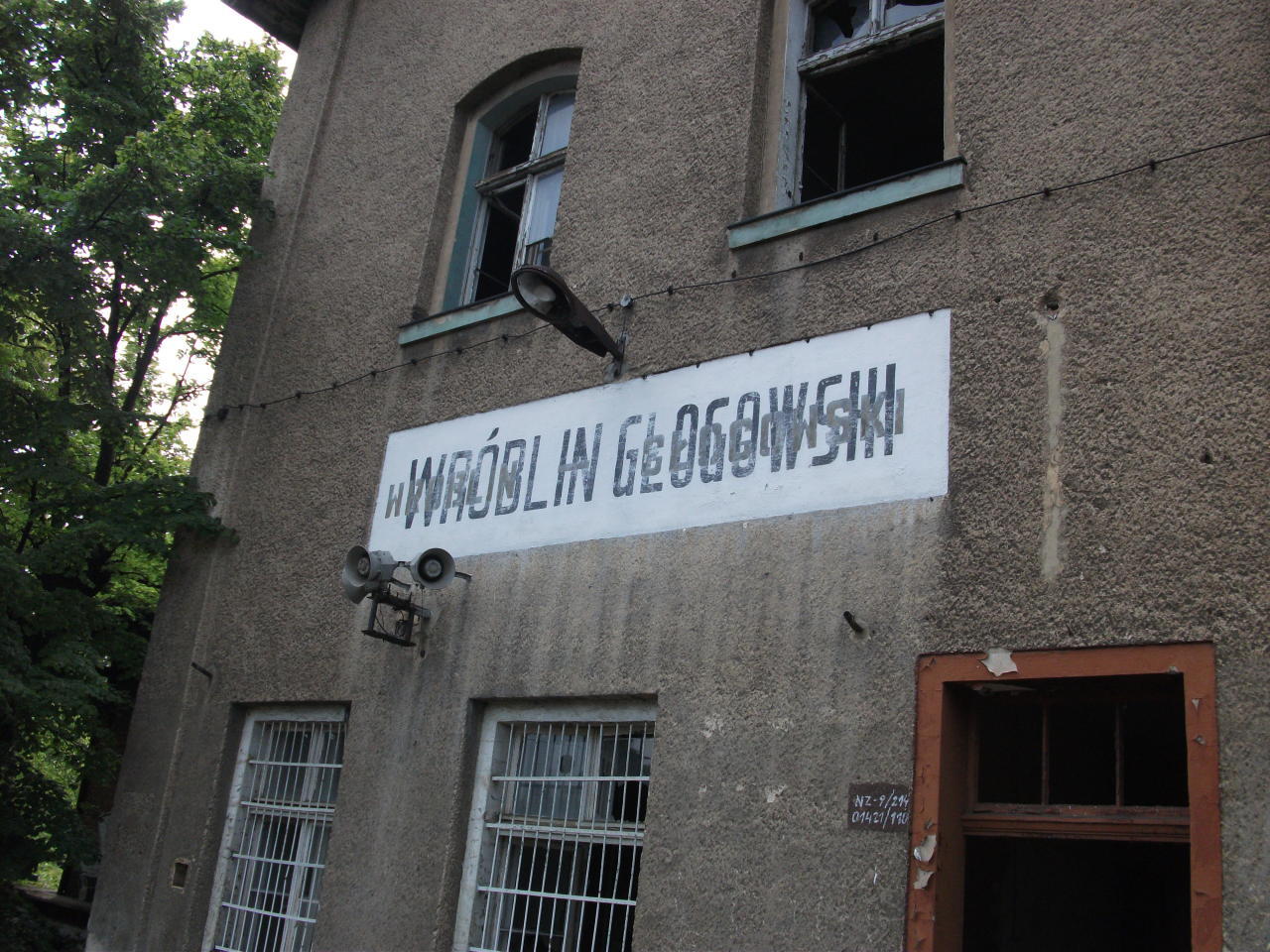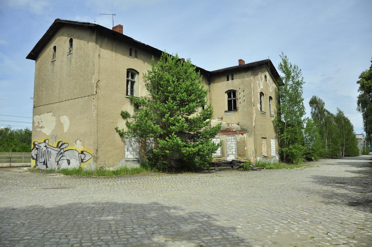 Wróblin Głogowski. Budynek stacji, widok od strony strefy ochronnej Huty Miedzi Głogów.