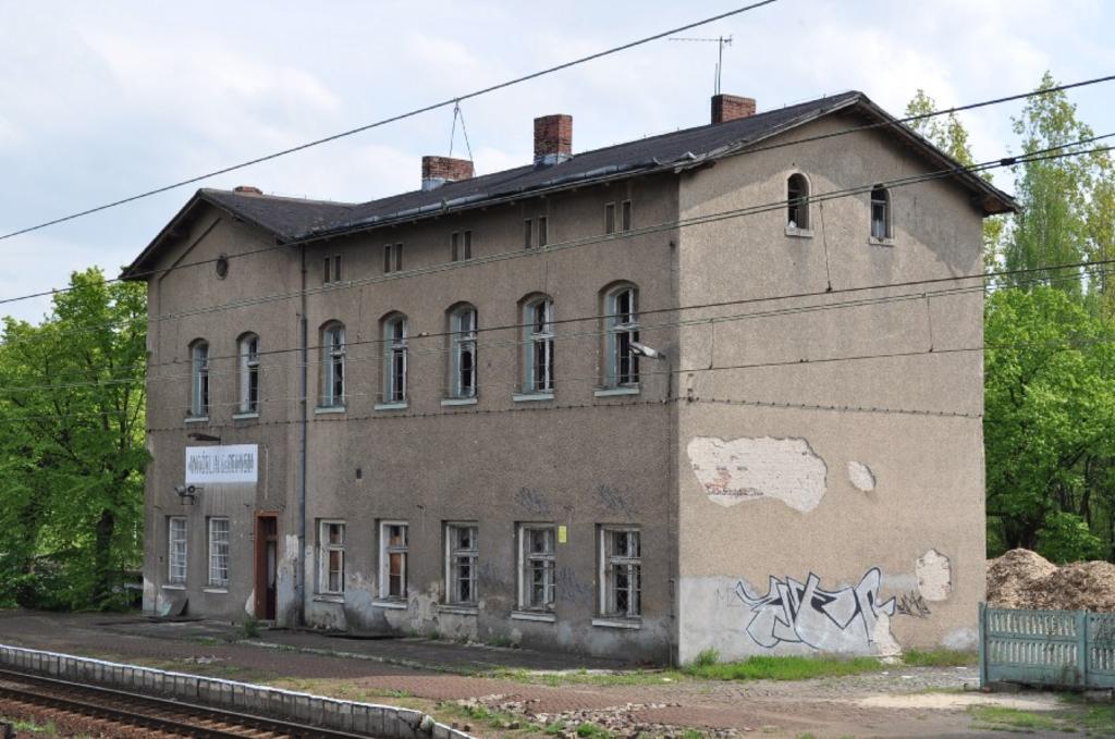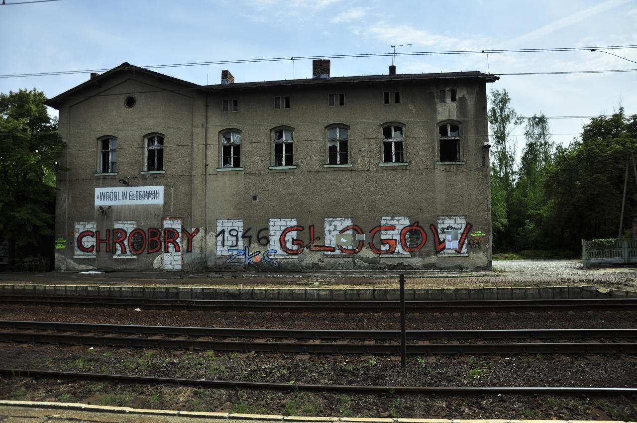 Wróblin Głogowski budynek dworca, widok w kierunku stacji Głogów (południowy-wschód).