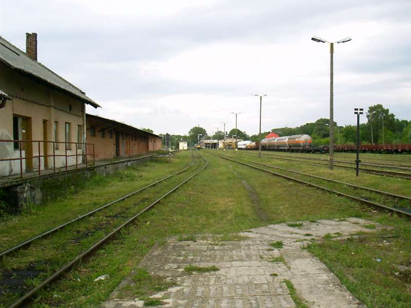 Widok w stronę Hrubieszowa z końca peronu. Z lewej strony magazyny towarowe.