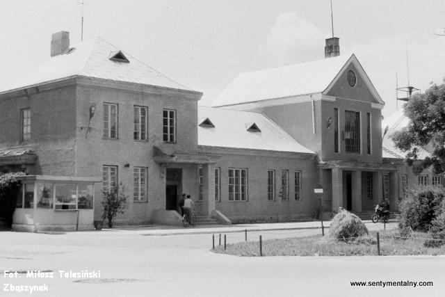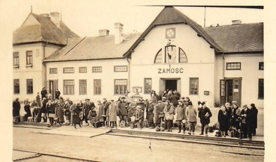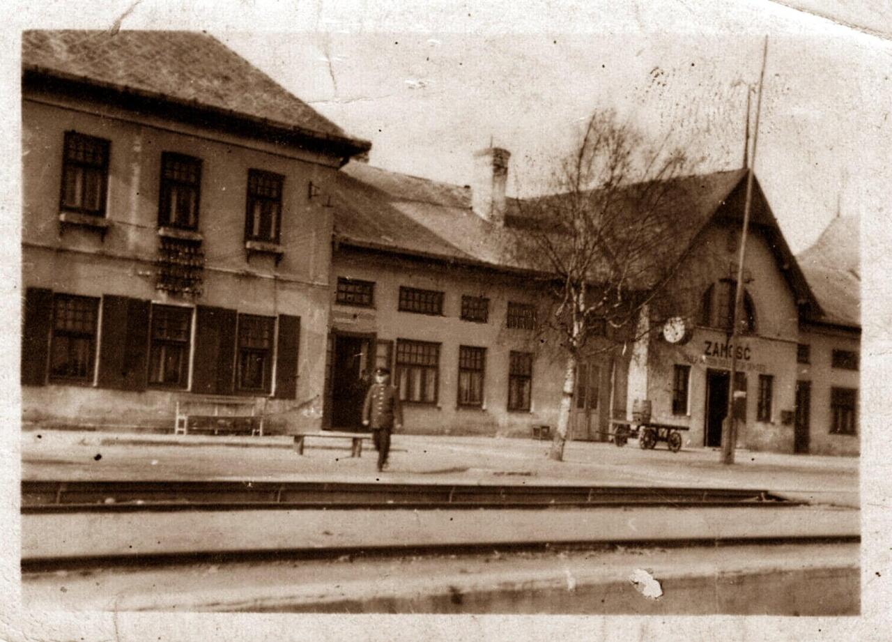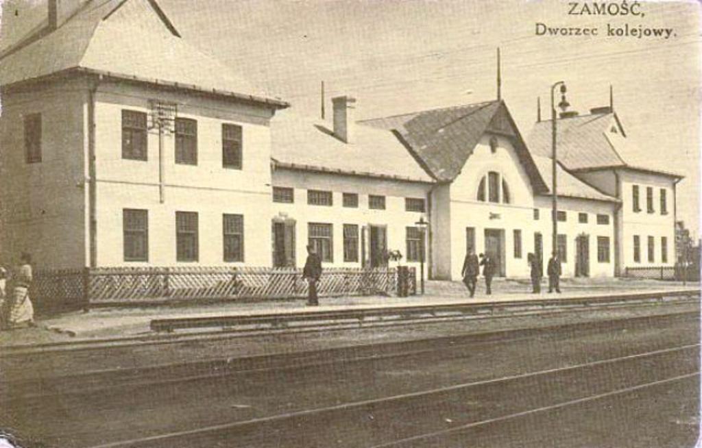 Ozdobiony swastyką budynek dworca w Zamościu. W lewo Zawada, w prawo Hrubieszów.