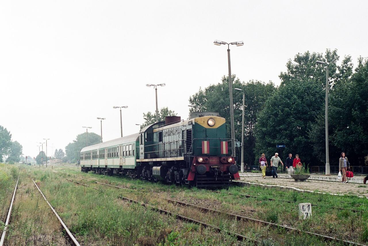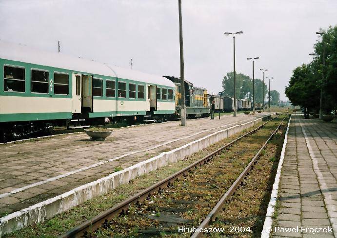 Stacja Hrubieszów Miasto, widok w kierunku północno-wschodnim na pociąg osobowy stojący przy peronie.