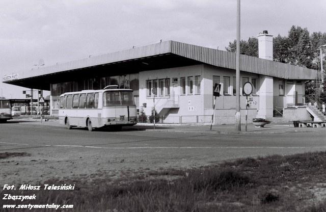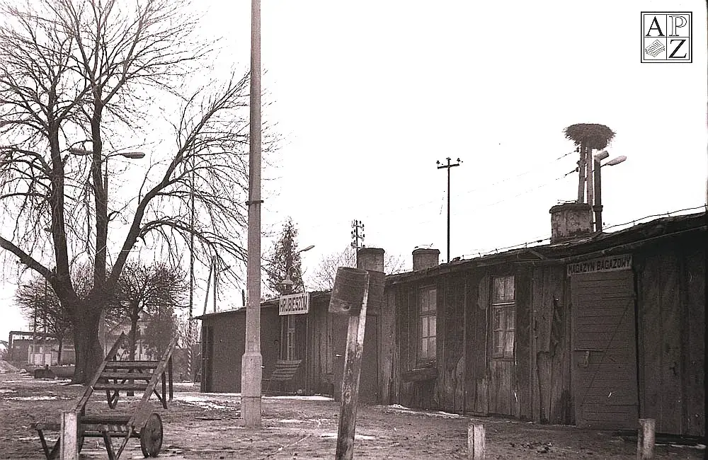 Stacja kolejowa w Hrubieszowie w roku 1980. Tymczasowy budynek dworca. Widok od strony podjazdu.