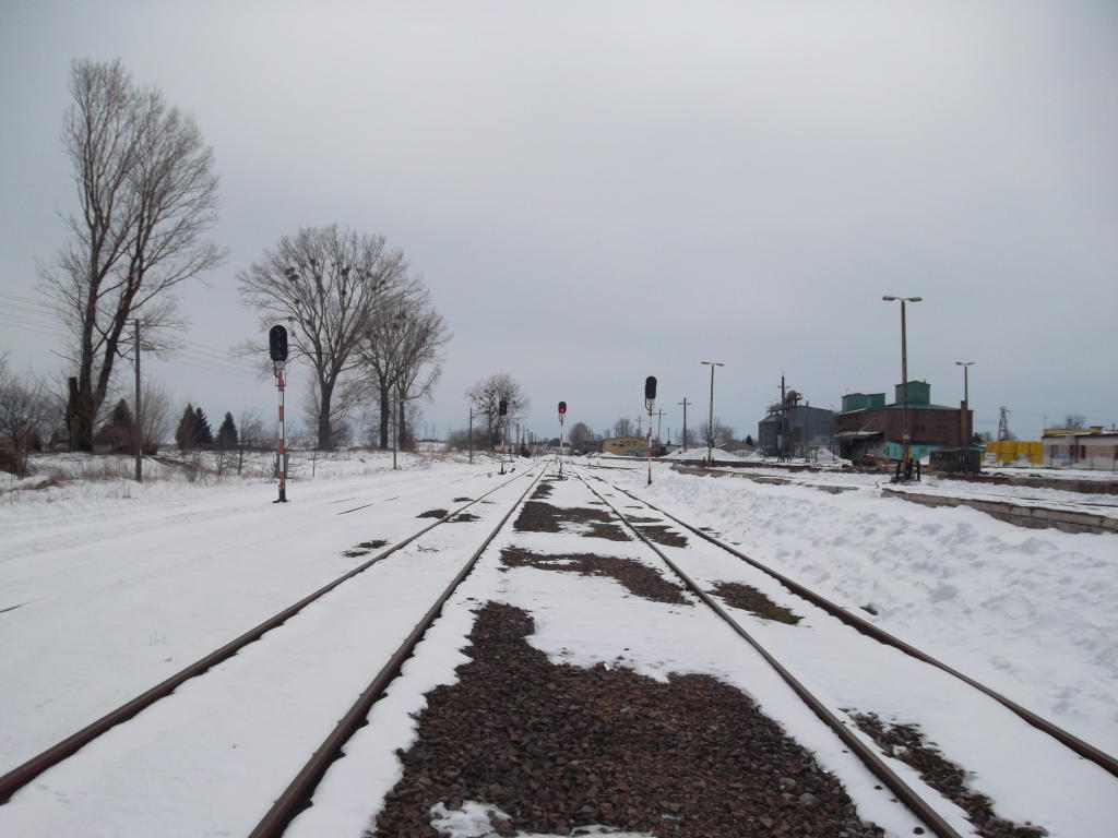 Wyjazd w kierunku Hrubieszowa Towarowego (LHS) - widok na północny-wschód. Z lewej strony (poza kadrem) biegnie tor do Zakładów Przemysłu Lniarskiego "Hakon" i terminalu gazu płynnego "Orlen".
