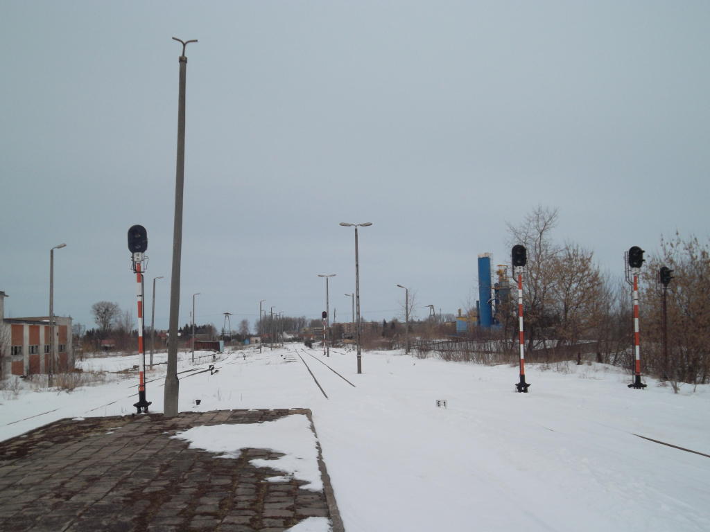 Semafory na wyjeździe w kierunku Hrubieszowa Towarowego LHS (północna głowica), po lewej zabudowania dawnej sekcji utrzymania taboru.