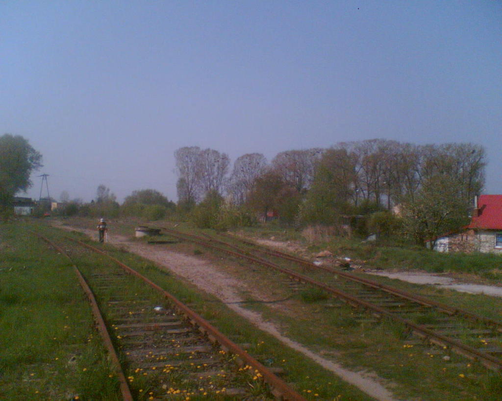 Zdjęcie robione komórką, dlatego słaba jakość. Tak w 2011 roku prezentowały się tory w kierunku peronu od strony ul. Nowej, rząd drzew na wprost już nie istnieje. Widok w kierunku południowo-zachodnim; na wprost perony, w prawo wagonownia.