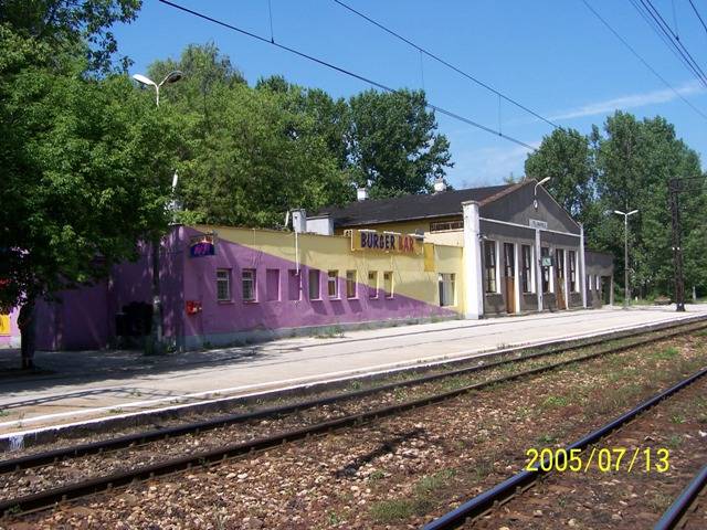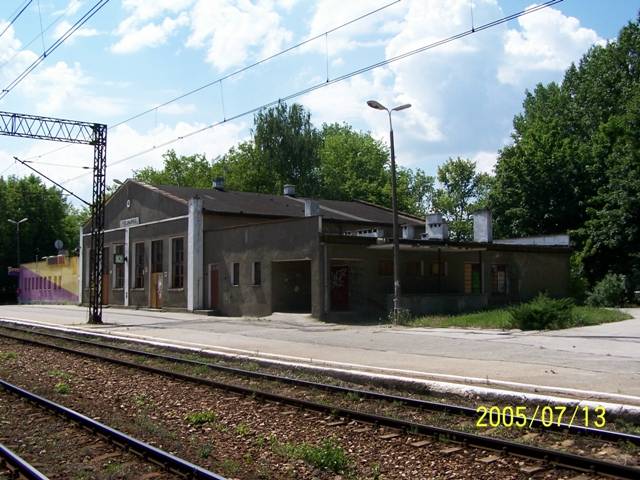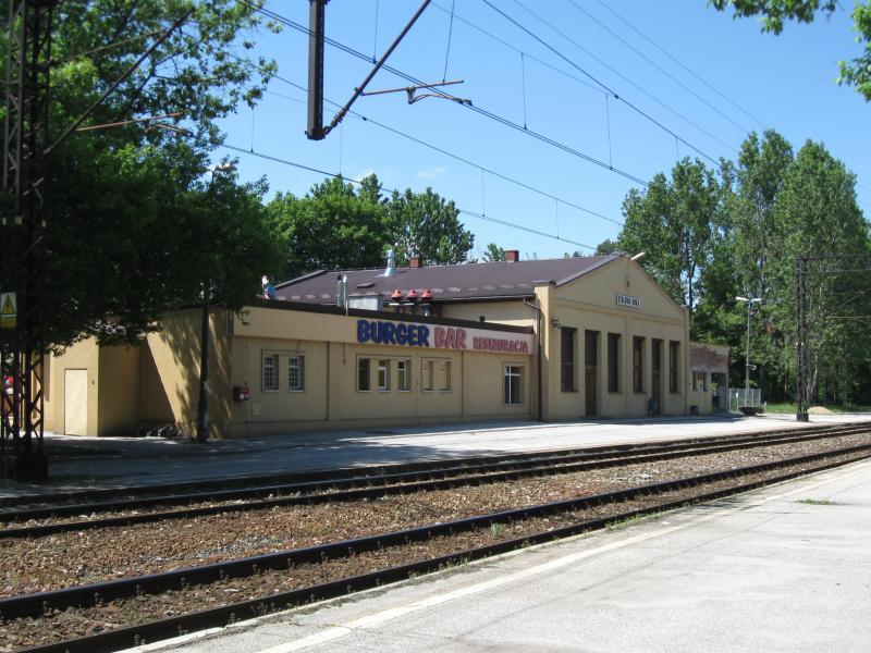 Budynek dworca od strony podjazdu, obecnie Karczma Biesiada w lewo Stalowa Wola Rozwadów w prawo Nisko. Na pierwszym planie bocznica do Stalowowolskiej Strefy Gospodarczej, dawniej Huty Stalowa Wola (w prawo).