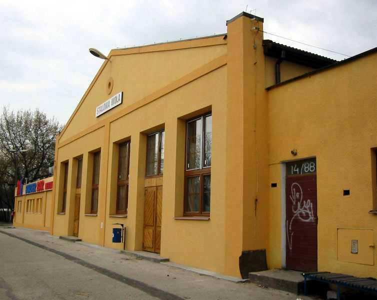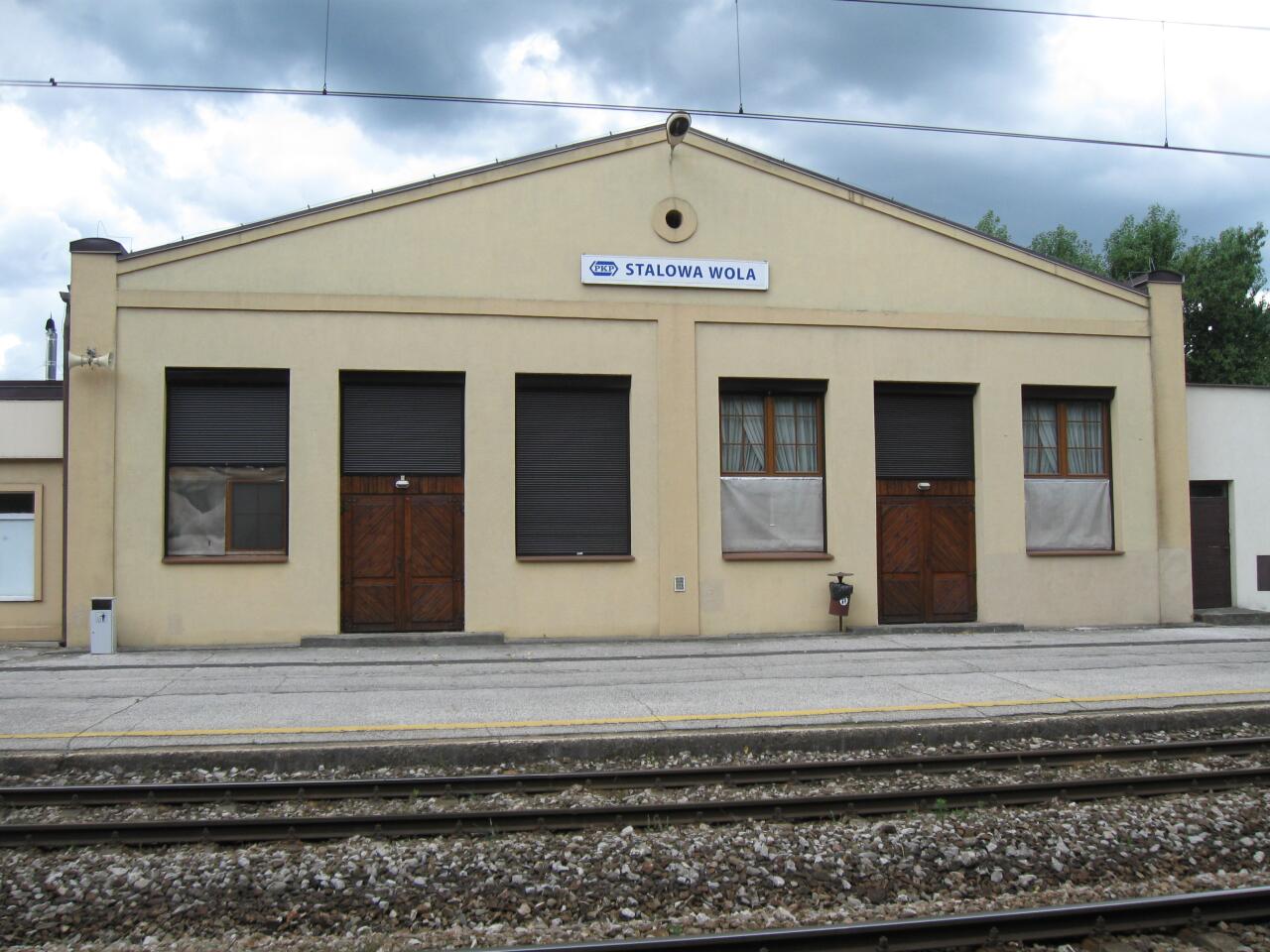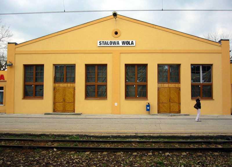 Widok na dawny budynek dworca (obecnie restaurację) oraz perony przystanku Stalowa Wola. Wjazd od strony Przeworska i Zwierzyńca.