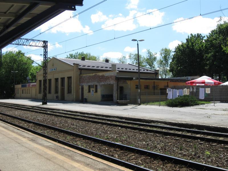 Stalowa Wola widok budynku dworca od strony torów, w lewo Stalowa Wola Południe i Nisko w prawo Stalowa Wola Centrum i Stalowa Wola Rozwadów.