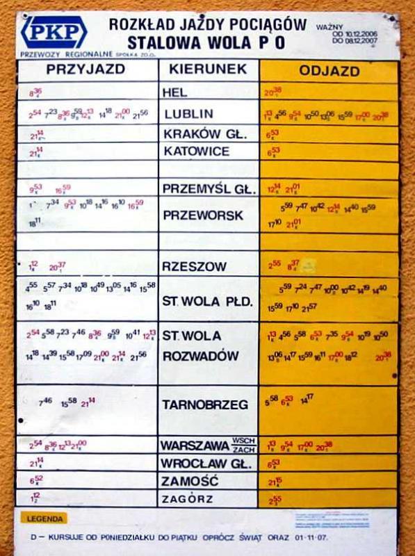 Rozkład jazdy pociągów na zewnątrz budynku dworcowego.