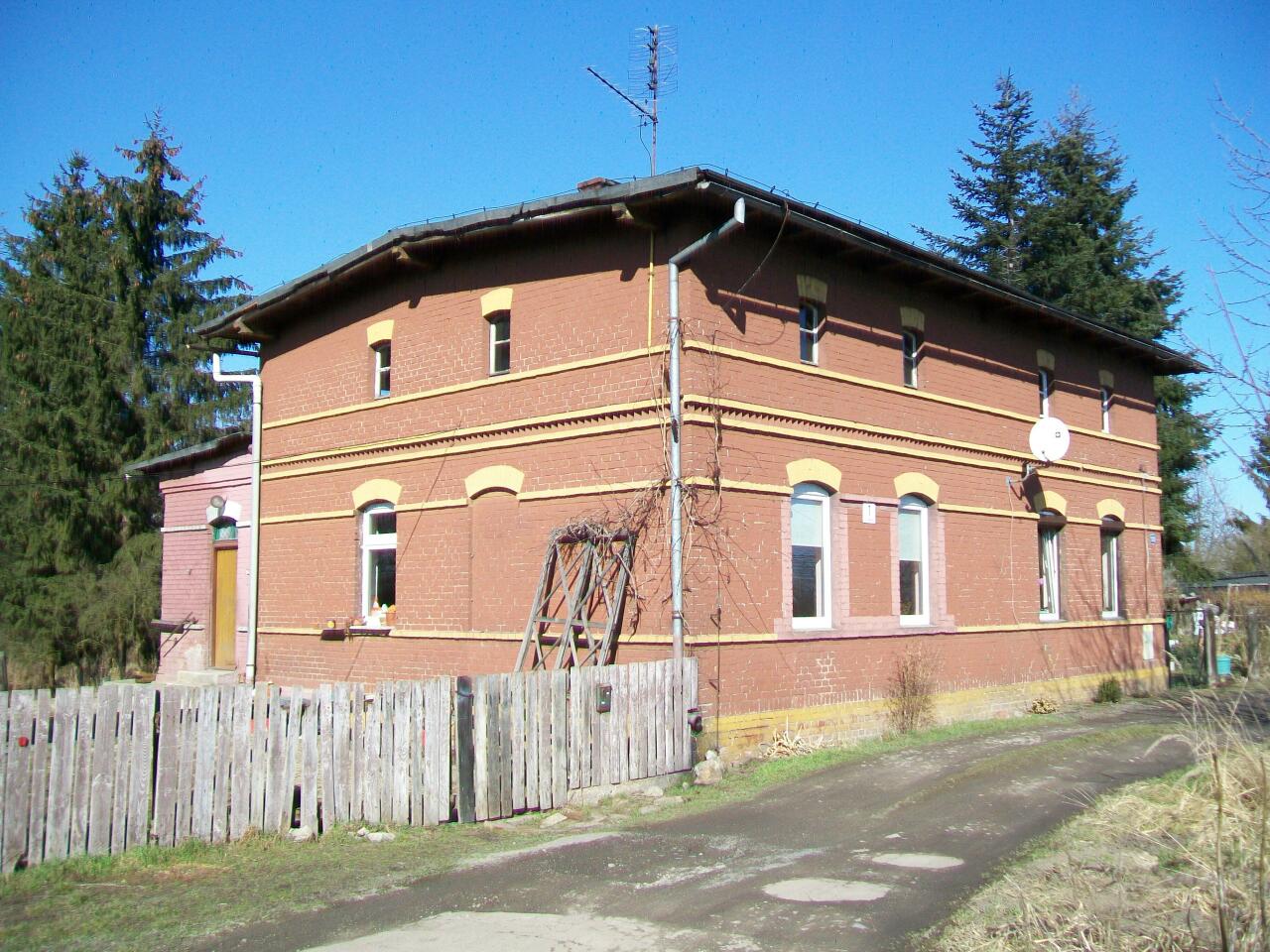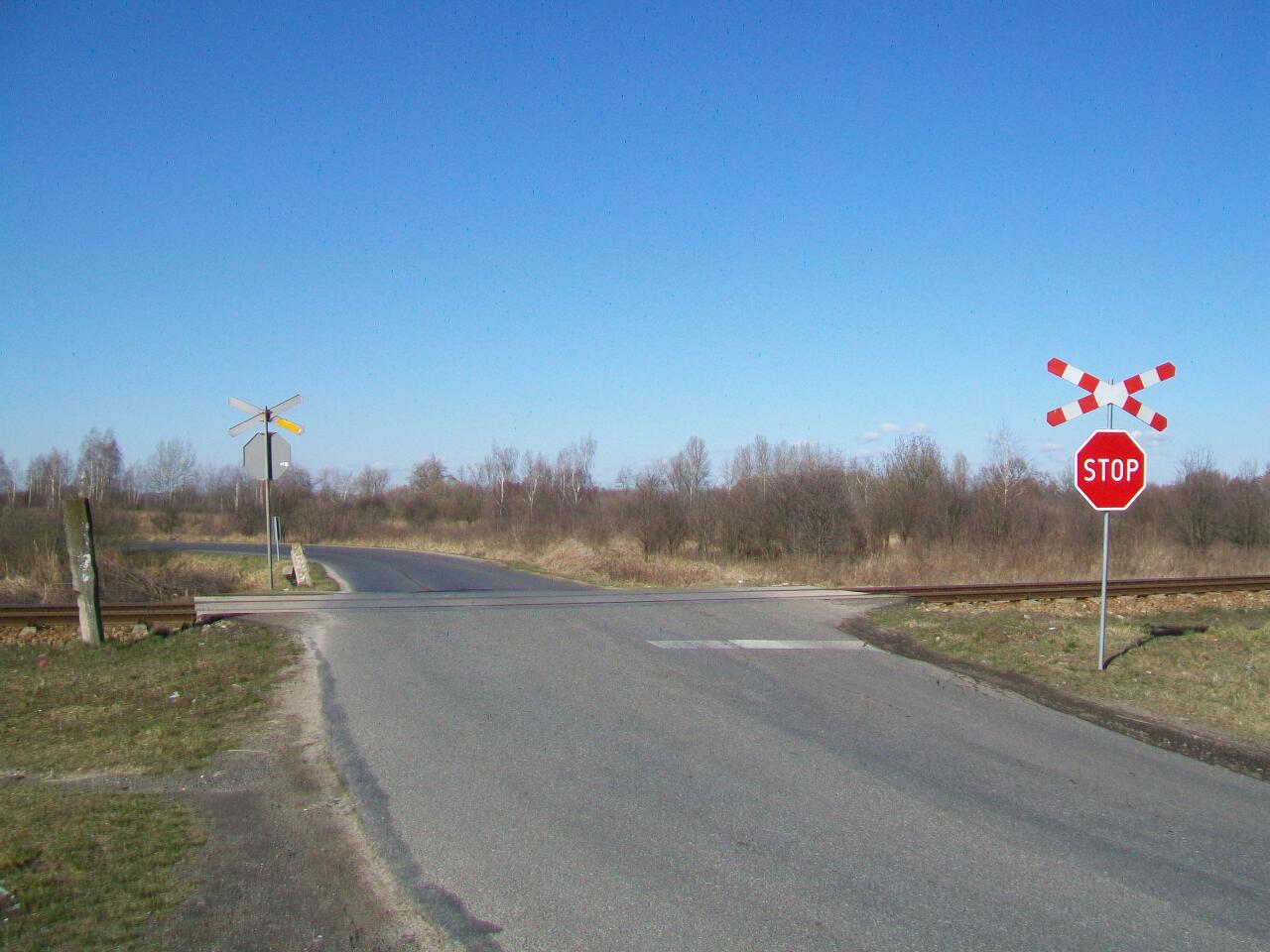 Kolejowy budynek mieszkalny stojący przy przejeździe kolejowym (za plecami) i drodze dojazdowej do dworca (na wprost). Widok w kierunku północno-zachodnim.
