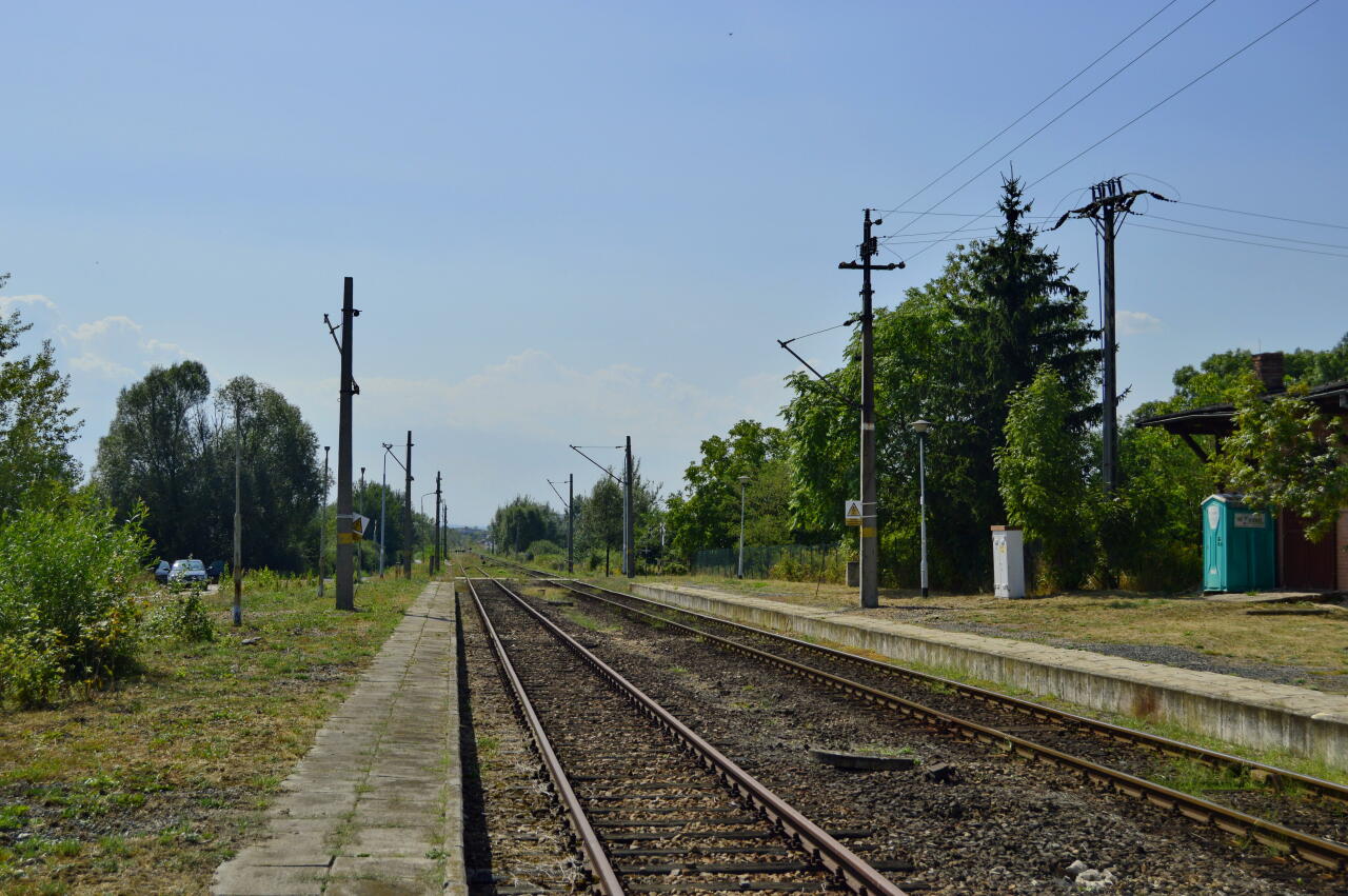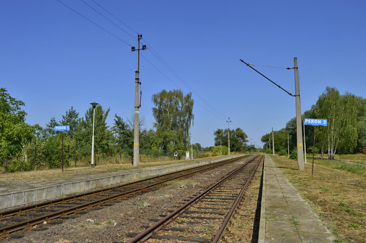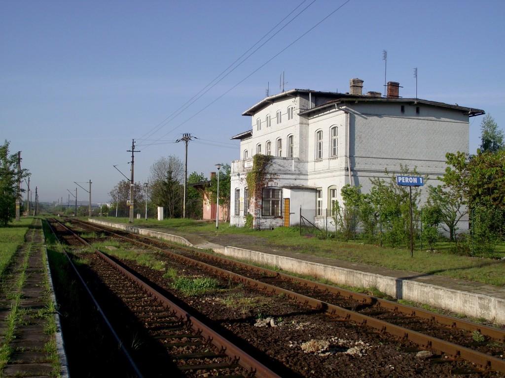 Widok w kierunku Jawora. Obecnie wykorzystywany jest tylko tor i peron pierwszy, w głębi widoczne słupy podtrzymujące kiedyś sieć trakcyjną.