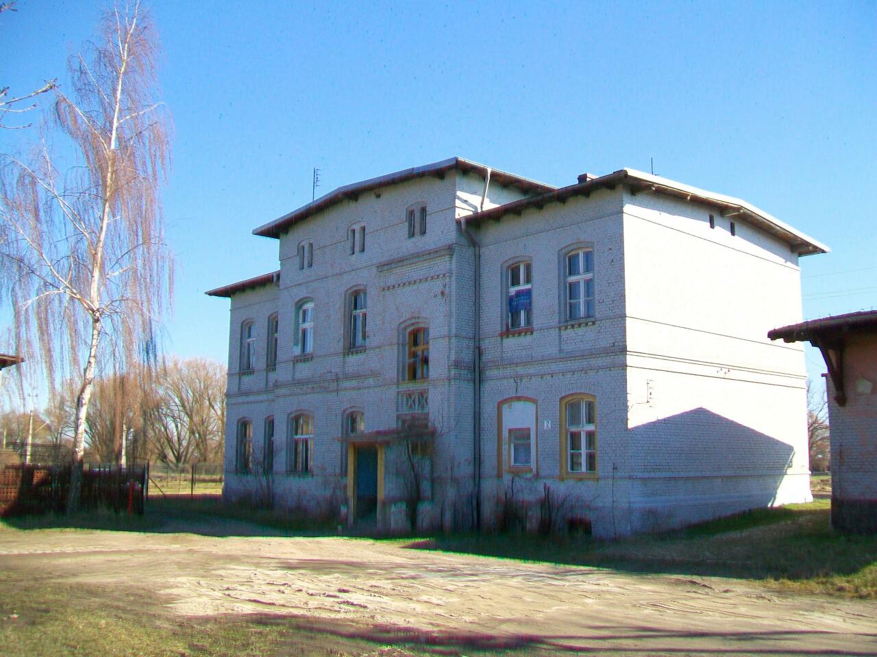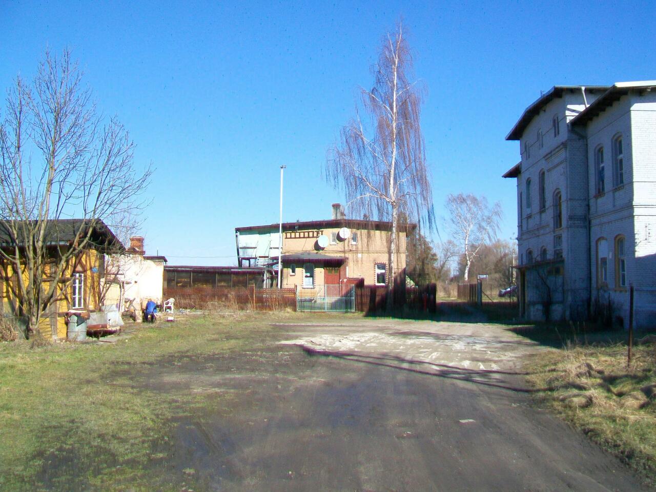 Plac przed dworcem (z prawej), przy którym skupia się większość okolicznej zabudowy (dom na wprost i budynek gospodarczy z lewej). Poza kadrem stoi jeszcze magazyn towarowy (w prawej) i drugi z budynków mieszkalnych (za plecami). Widok w kierunku północnym.