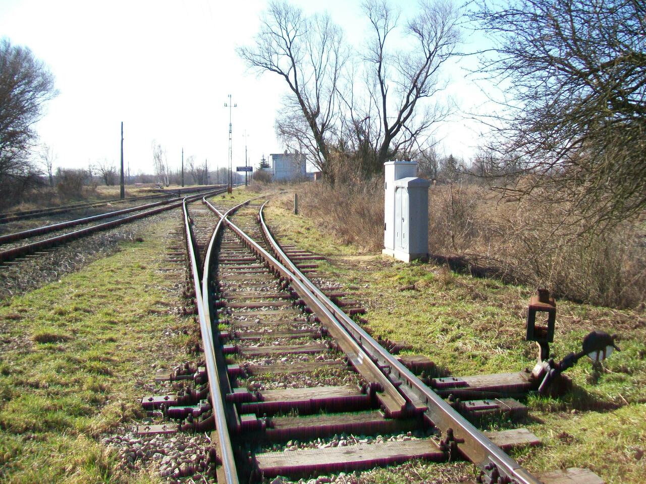 Rozjazd na wyjeździe z punktu zdawczo-odbiorczego. Z lewej tory nieczynnej mijanki, w prawo bocznica do złomowiska. W tle perony. Widok w kierunku południowym (Jawor).