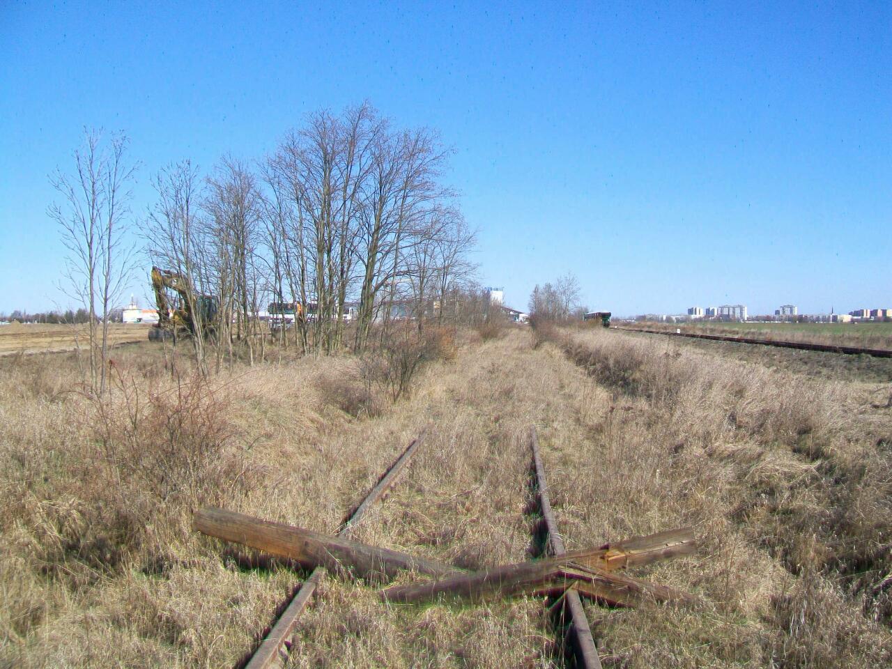 Jeden z ostatnich kawałków toru na terenie dawnej bazy wojsk radzieckich. Mimo rozwoju różnorakich działalności gospodarczych na tym terenie, nikt nie zdecydował się na skorzystanie z transportu kolejowego. Z prawej (poza kadrem) ul. płk. Karola Myrka. Widok w kierunku zachodnim (koniec toru).