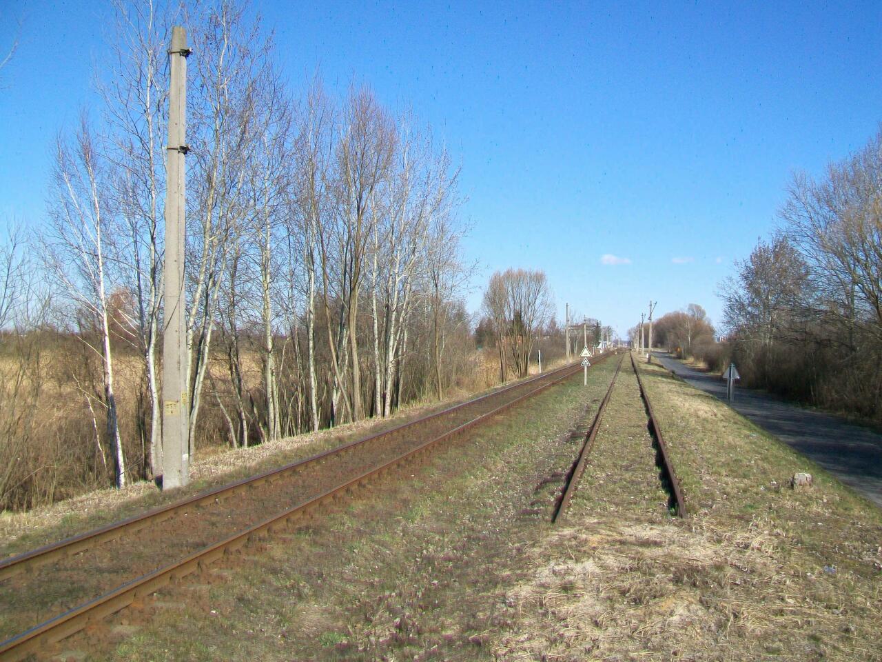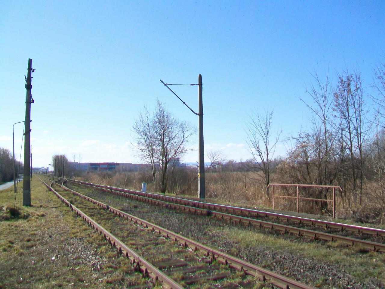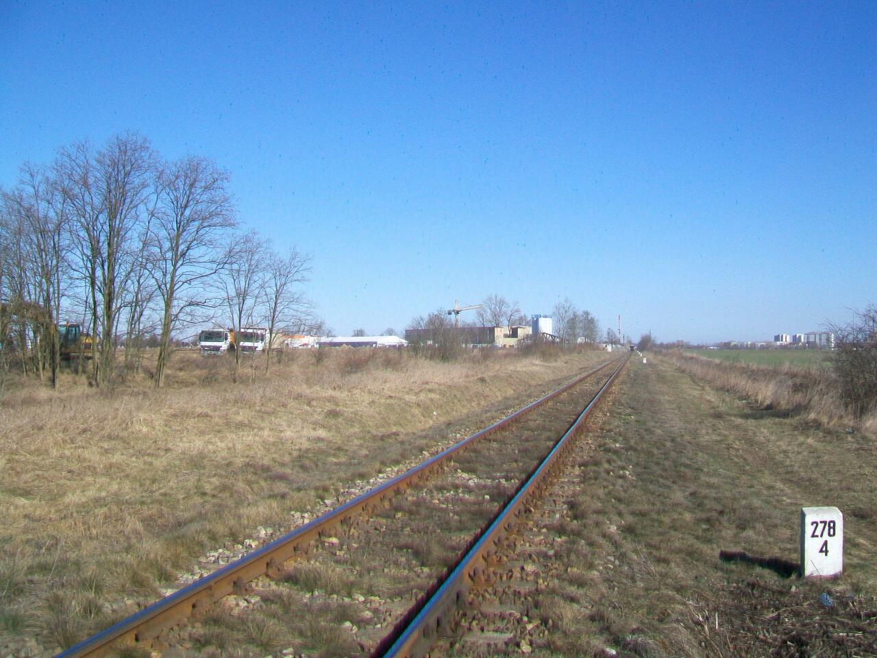 Urwana bocznica do dawnej bazy wojsk radzieckich. Mimo, że na jej terenie powstały nowe przedsiębiorstwa, to żadne nie zdecydowało się na korzystanie z transportu kolejowego. Z prawej tor szlakowy do stacji Legnica, a w tle osiedle Piekary w Legnicy. Widok w kierunku północnym.