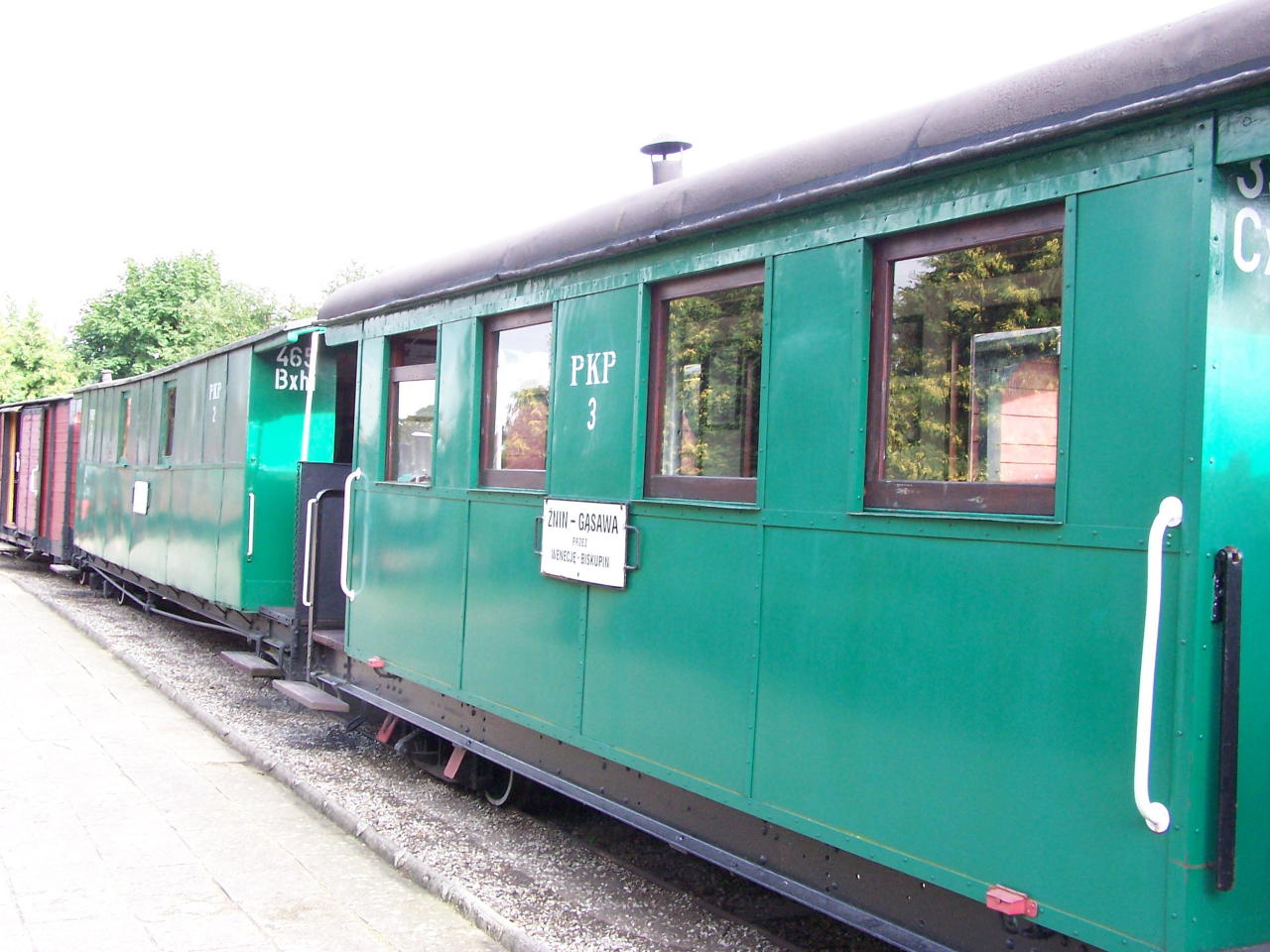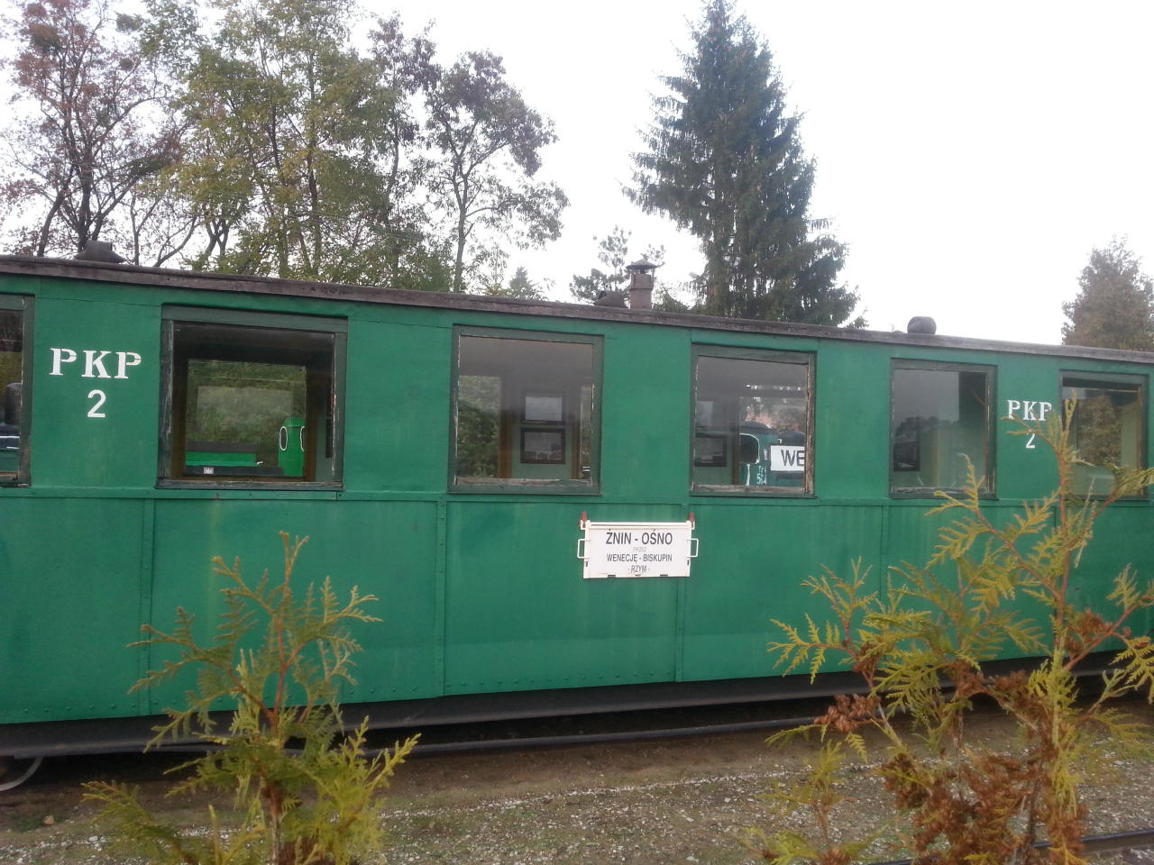 Wagon z tabliczką dawnej relacji - obecnie odcinek Biskupin Odcinek - Ośno Wąsk. jest rozebrany.